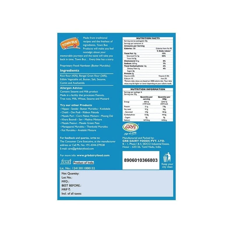 GRB Town Bus Butter Murukku is a delicious South Indian savory snack that brings authentic taste and crispiness in every bite. Made from high-quality ingredients, this butter murukku is perfect for satisfying your cravings. The rich, buttery flavor combined with a crunchy texture makes it an ideal snack for any time of the day.