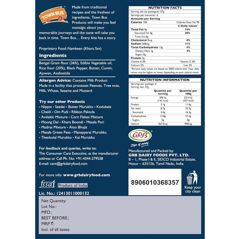 Indulge in the delightful taste of GRB Town Bus Khara Sev, a crunchy and flavorful snack perfect for any occasion. Made from high-quality gram flour, this savory treat is seasoned with spices to provide a perfect blend of taste and texture. Whether enjoyed on its own or paired with your favorite chutneys, it s an ideal companion for tea time or a festive gathering.