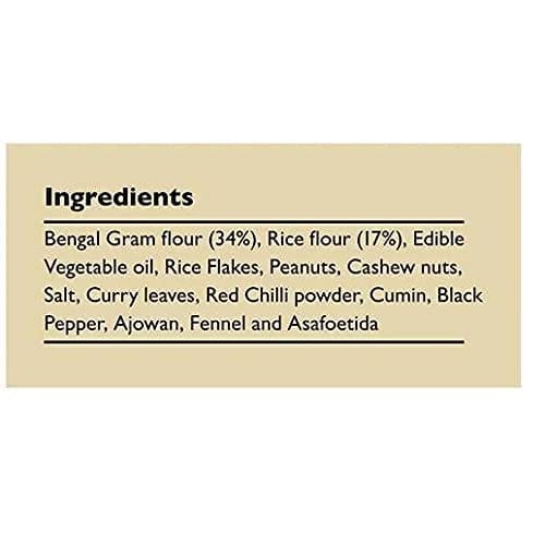 Gram Flour, Lentils, Peanuts, Rice Flakes, Edible Oil, Curry Leaves, Red Chili Powder, Asafoetida, and Salt.