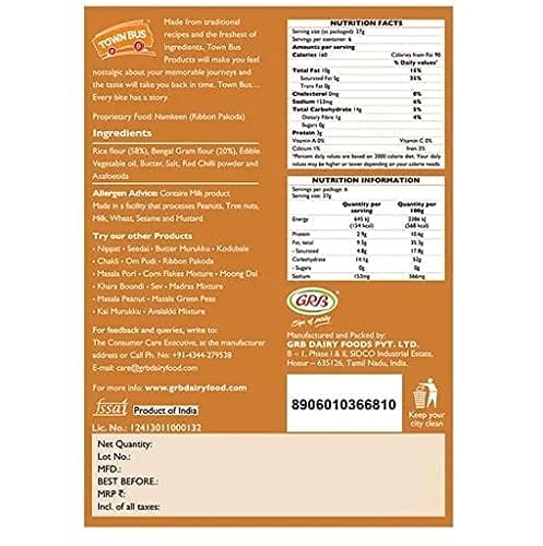 GRB Town Bus Ribbon Pakoda is a delightful and crunchy South Indian snack made from rice flour and seasoned with a unique blend of spices. This crispy treat is a popular choice for tea-time snacking or as a delicious addition to festive occasions. Each bite offers a perfect combination of flavor and crunch, making it an irresistible snack for all ages.