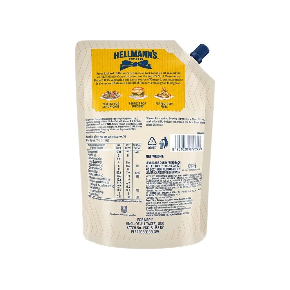 Hellmann's has truly become the world's no. 1 mayonnaise brand. With a rich, creamy texture and an unmistakable taste, it's no wonder Hellmann's is winning hearts across the globe. Delicious, smooth, and 100% vegetarian, Hellmann's real mayonnaise pairs well with sandwiches, burgers, and almost everything else, so you can truly bring out the best in your food. Spread it across a slice of toast, or dollop it onto your burger and relish its wonderful, wholesome flavor. Hellmann's real mayonnaise is carefully crafted with ingredients that are an excellent source of good fats such as polyunsaturated fatty acids (pufa)/ omega 6, are virtually trans-fat, and are fortified with essential vitamins A & D