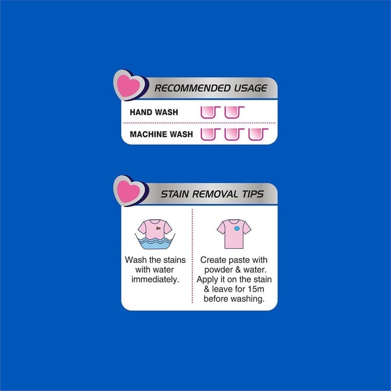 Usage: Use as per recommended dosage for machine or hand wash. For tough stains, pre-soak the garment in a solution of detergent before washing.