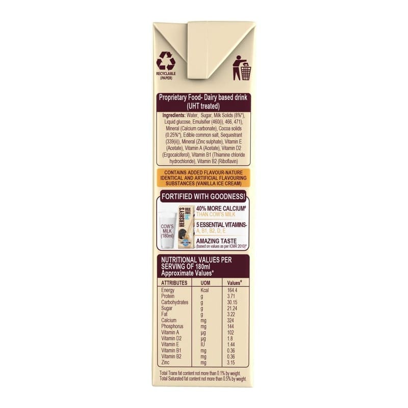 HERSHEY'S Milkshake is delicious, thick and creamy and comes in 6 exciting flavors! Enriched with 40% more calcium than Cow's Milk, the goodness of Zinc and Vitamins to support a healthy lifestyle. HERSHEY'S Milkshake contains no artificial preservatives, making it a healthier choice. It is the perfect partner for on-the-go snacking or as a refreshing treat at home or work. It can be enjoyed chilled or at room temperature and comes in convenient tetrapak packaging, making it super easy to store. Its great for kids and adults, with a fun and flavorful twist on classic milkshakes. HERSHEY'S Milkshake is suitable for vegetarians and a great choice for anyone to stay refreshed, nourished and energized.
