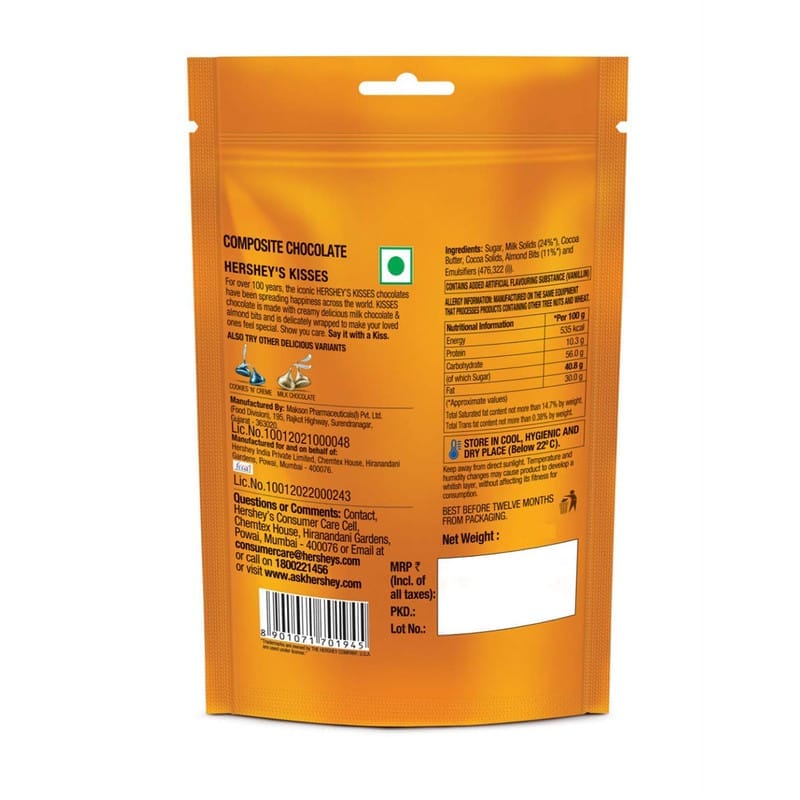 Dive into a world of indulgence: Enjoy crunchy almond bits in luscious creamy milk chocolate in HERSHEY S KISSES Almonds.Perfect bite-sized chocolates in 5 delectable flavors. .Perfect for sharing: Melt-in-mouth, delicious chocolates that are individually wrapped to make your loved ones feel special.Made to express:HERSHEY'S KISSES is the perfect partner to make your loved ones feel special. When words fall short. Say It with a Kiss! Comes in bite-sized, individually wrapped units to help make sharing and consumption easier and funA fun and crunchy twist:Great for sharing with friends and family; made with delicious creamy milk chocolate with a crunchy twist of almond bits. Suitable for vegetarians and a great choice for anyone who loves delicious, melt-in-mouth chocolates.