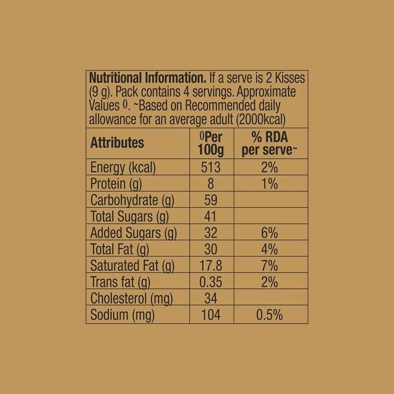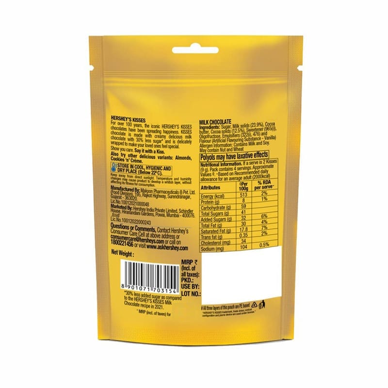 HERSHEY'S Kisses Milk Chocolate with 30% Less Sugar! Indulge in the same great taste; now with upto 30% less sugar! No artificial sweeteners added!Experience delicious melt-in-mouth chocolate with the perfect sweetness that you can enjoy without the guilt!HERSHEY'S Kisses is made with delicious rich chocolate that are delicately wrapped individually to make your loved ones feel special. It is known and loved across the world as a way of expressing affection to those close to you. Show them you care. Say it with a Kiss.