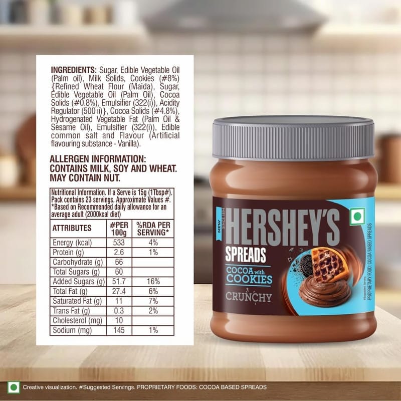 Presenting HERSHEY'S Spreads Cocoa with Cookies! Enjoy the delectable taste of HERSHEY'S chocolate spreads with the crunch of cookies, the perfect match for each other and your breakfast. This deliciously unique combination of amazing chocolatey spreads and cookies is a pure bliss for your senses. Add yumminess of HERSHEY'S Spreads to your breakfast with bread, roti, paratha, idli, dosa, cake, biscuit, fruit, waffle, doughnut, croissant and much more.1071-70368-003