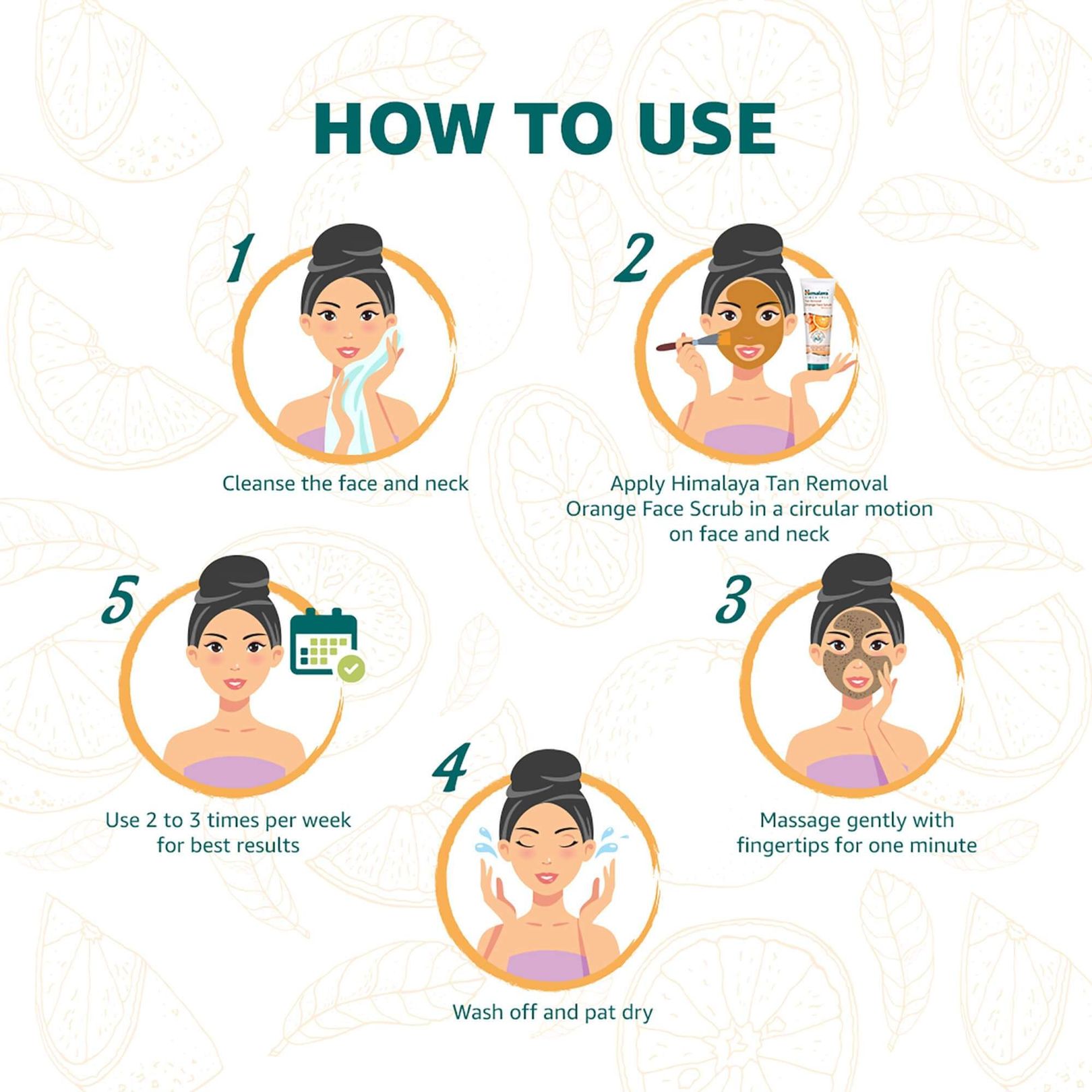 Apply Himalaya's Tan Removal Orange Face Scrub in a circular motion on the face and neck, avoiding the area around the eyes. Massage gently with fingertips for one minute. Wash off and pat dry. Use 2-3 times weekly to eliminate tan. Suitable for all skin types.