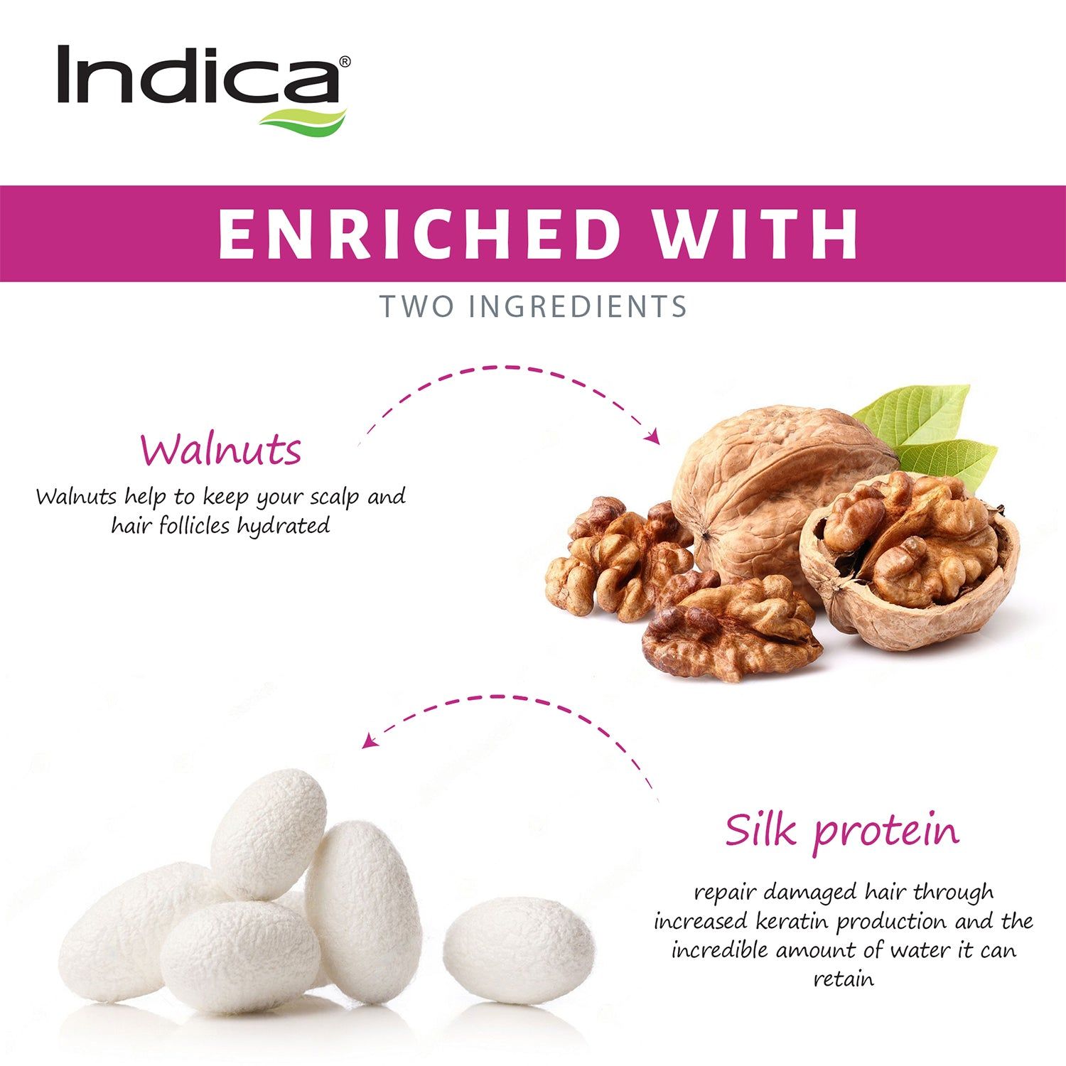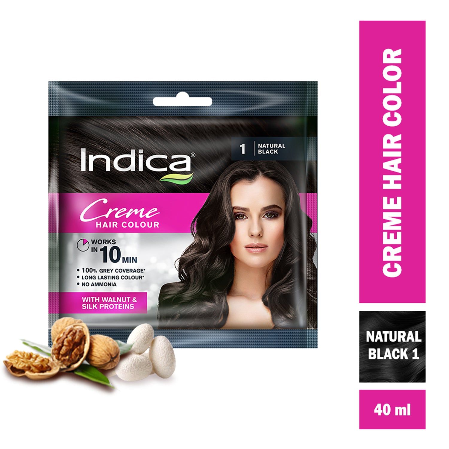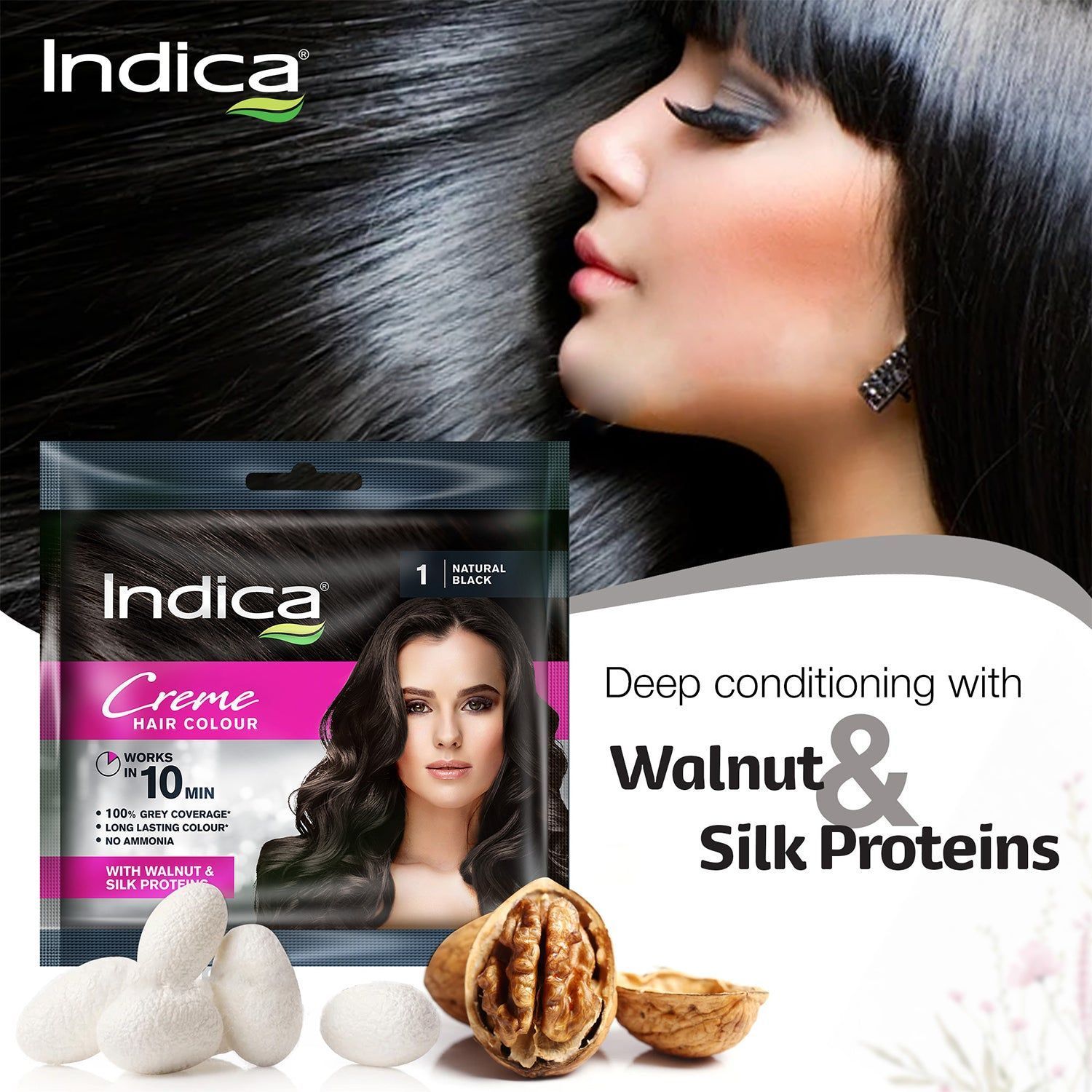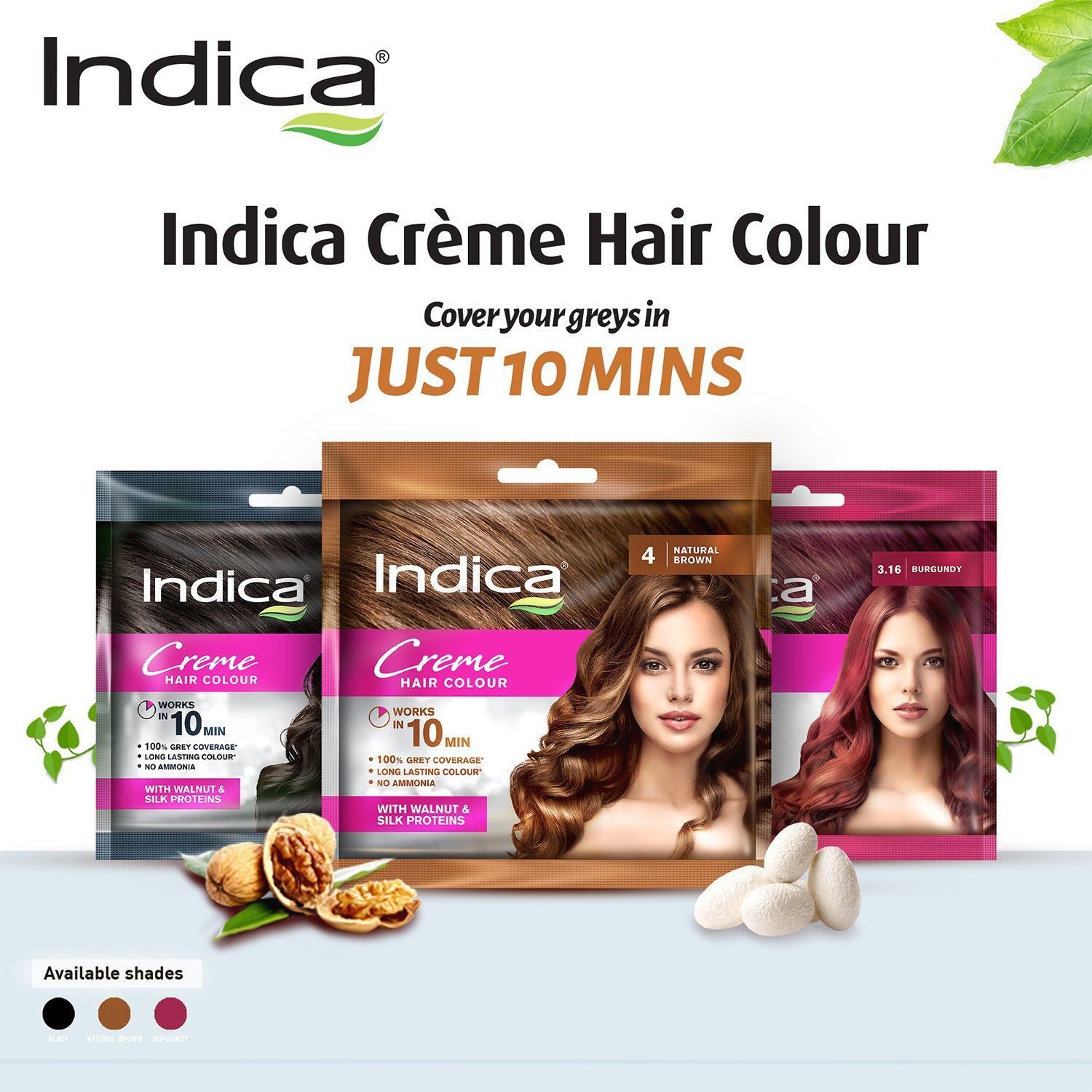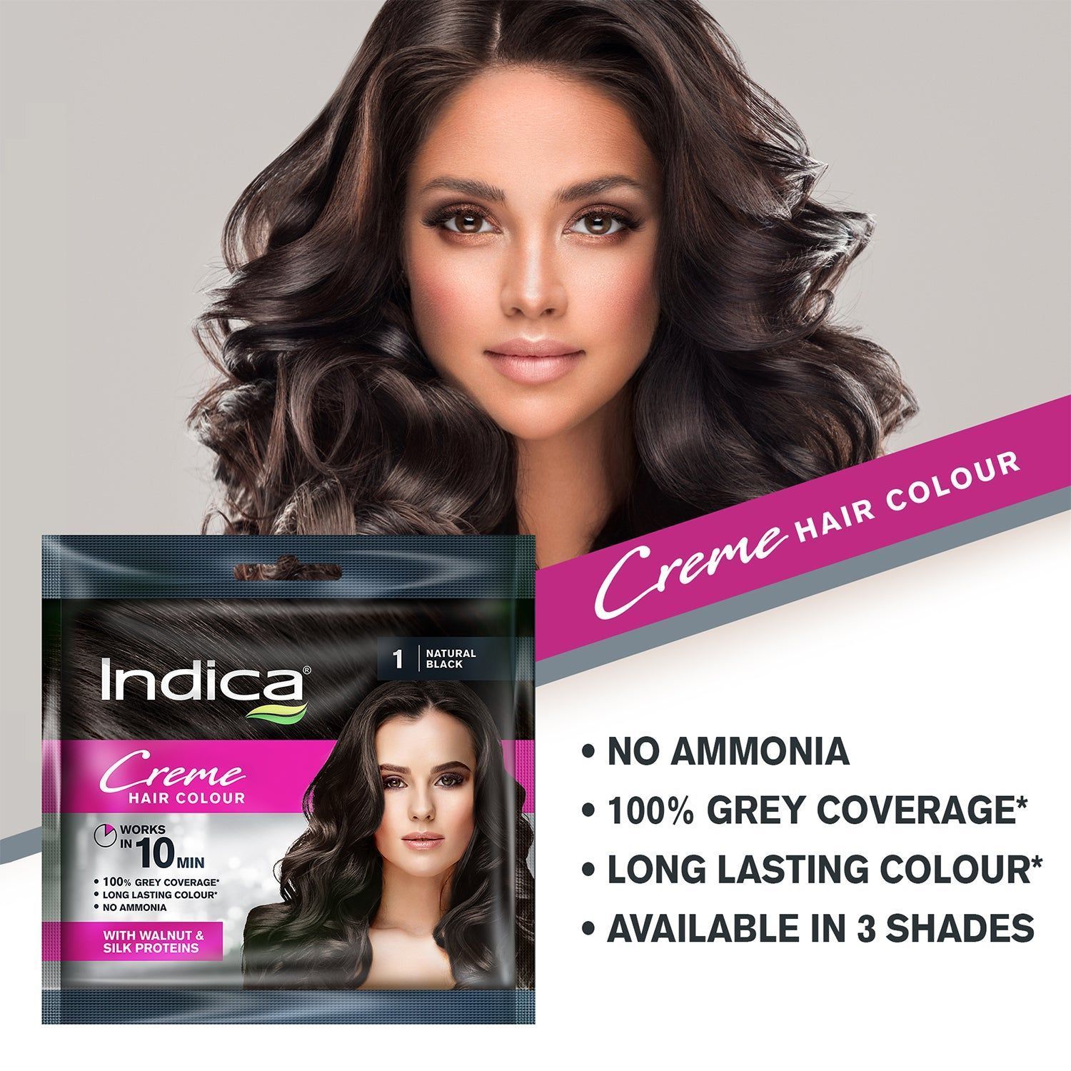Indica Creme colour is an Ammonia-Free hair colour enriched with the goodness of Walnuts and Silk protein. This creme-based hair colour gives 100% grey coverage in just 10 minutes of application. It locks the colour for long-lasting and vibrant results. The DIY 10 minutes hair colour is easy to apply at home. The most compatible long-lasting hair colour with your scalp is easy to apply at home. A very convenient usage that requires no hassle. Just empty the sachets, mix the contents and apply on the hair. The 10 minutes Creme hair colour comes in 3 shades: Natural Black; Natural Brown and Burgundy.This pack contains Colourant-20g; Developer-20ml; Instruction leaflet.How to Use:1. Put on hand gloves.2. Mix the colourant and developer in a non-metallic bowl with a hair colour brush.3. Apply the mixture to washed and dried hair with the brush.4. After 10 minutes, rinse hair thoroughly with water.Indica Hair Colours are suitable for all hair types. We are introducing the new Indica Easy Shampoo Color + Care Kit Pack which is a 3-in-1 Kit Pack consisting of Hair Colour, Conditioner and Hair Serum. We also have the super easy shampoo hair colouring formula i.e. Indica Easy Sachet which is available in 3 Shades: Natural Black, Dark Brown and Burgundy. Also, we have a Creme Based Sachet which is also available in 3 Shades: Natural Black, Natural Brown and Burgundy.