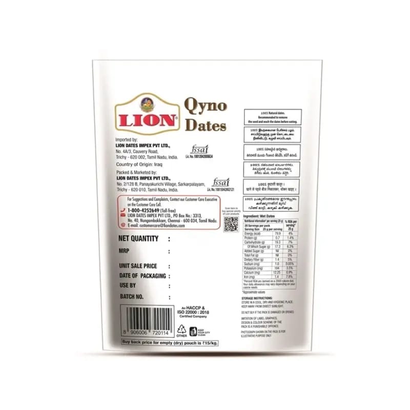 Experience the natural goodness of Lion Qyno Seeded Dates, handpicked for superior quality and taste. These delicious, energy-rich dates are packed with essential nutrients and come in a convenient pouch to maintain freshness.
