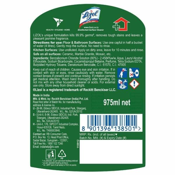 Keep your home clean and fresh with Lizol Jasmine Disinfectant Surface Cleaner. It is perfect for floors, tiles, sinks, kitchen counters, and all other washable surfaces in your home. It leaves a long-lasting fragrance and removes tough stains easily. It helps in giving your home a visibly clean surface. So go ahead and buy this product online today!