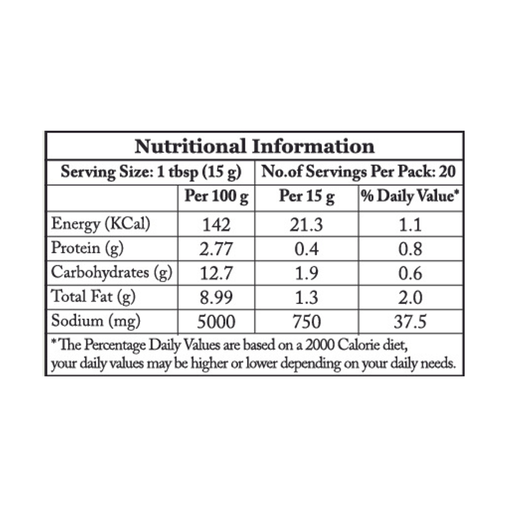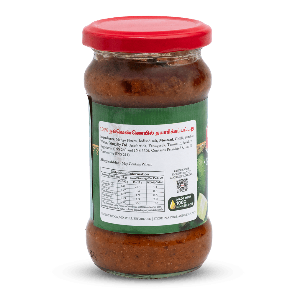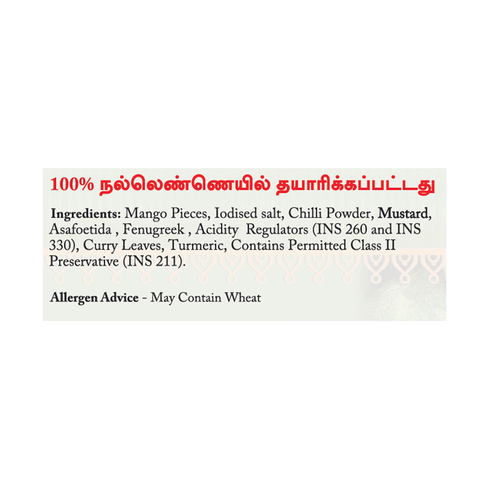 Mango pieces, Salt, Gingelly oil, Chilli powder, Mustard powder, Asafoetida, Fenugreek powder, Acidity regulator (E 260 & E 330), permitted Class II preservatives (E 211)
