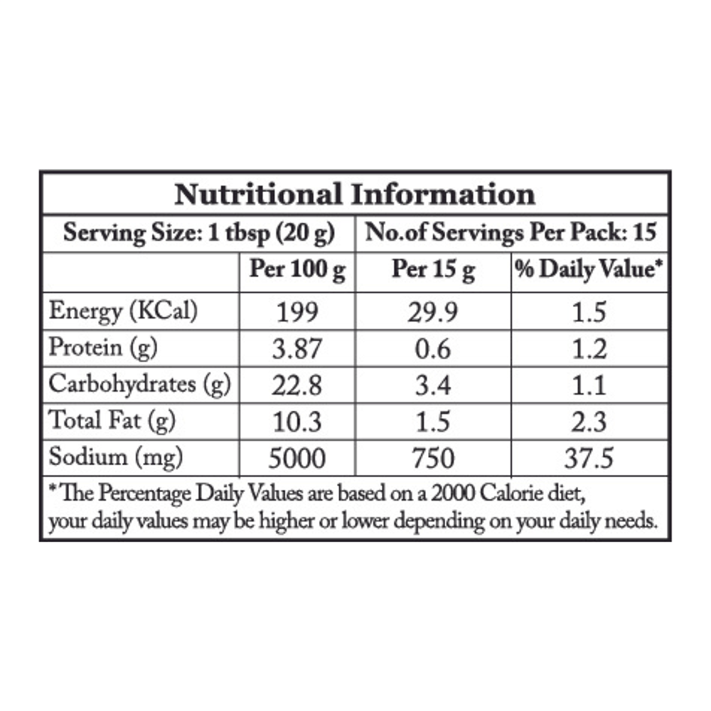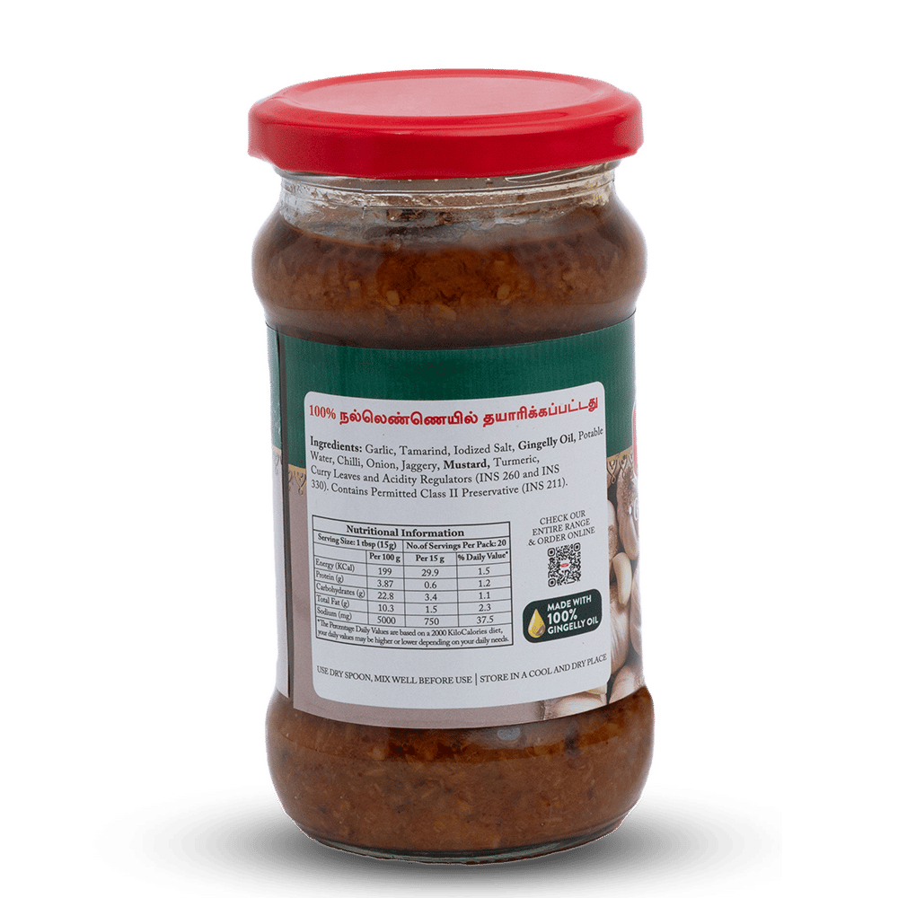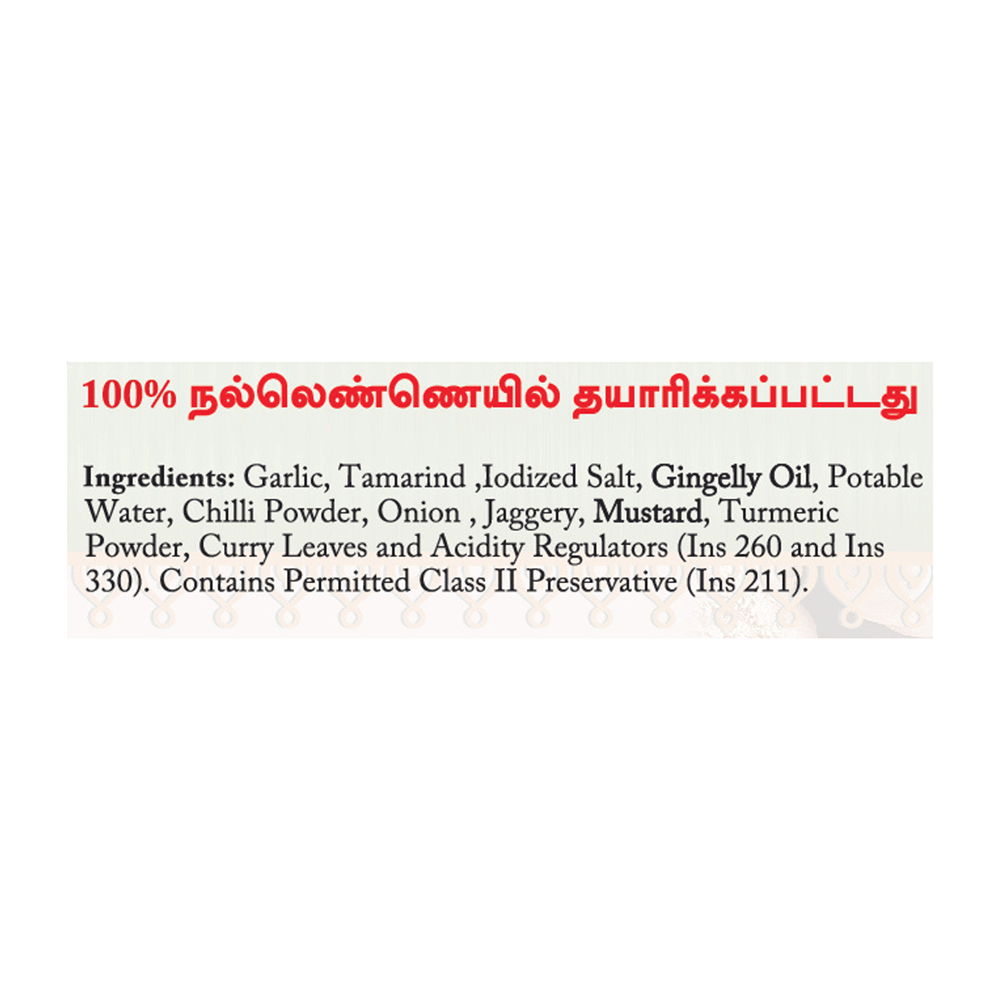Tamarind paste, Coriander powder, Salt, Toor dal powder, Cumin, Chilli powder, Asafoetida, Pepper powder, Mustard, Turmeric powder, Gingelly oil, Acidity regulator 330, Class II preservatives (E 211).