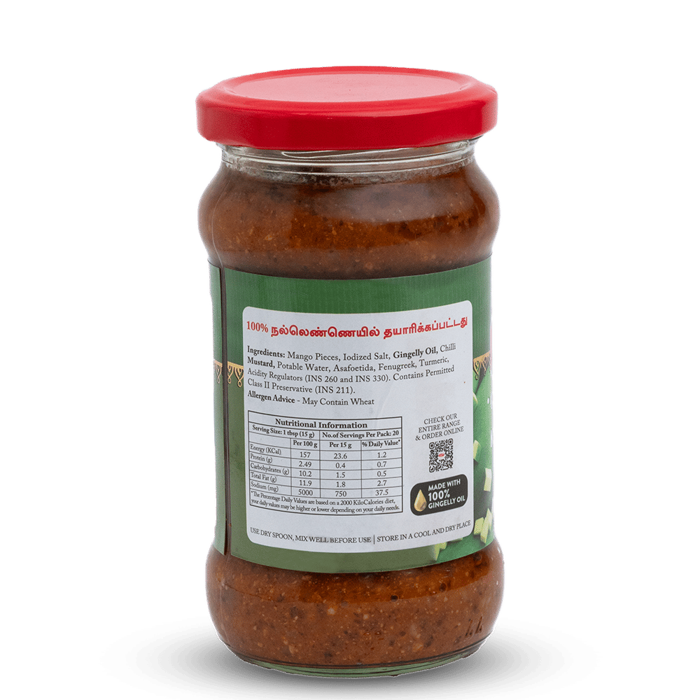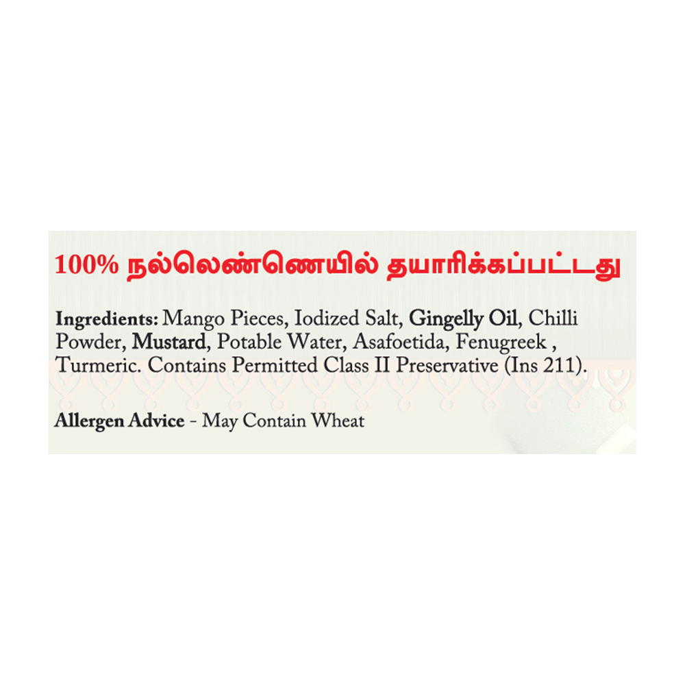 Cut mango, Gingelly oil, Salt, Chilli powder, Fenugreek powder, Asafoetida, Acidity regulator (E 260), Mustard, Acidity regulator (E 330), and Turmeric powder. Contains permitted Class II preservatives (E 211).