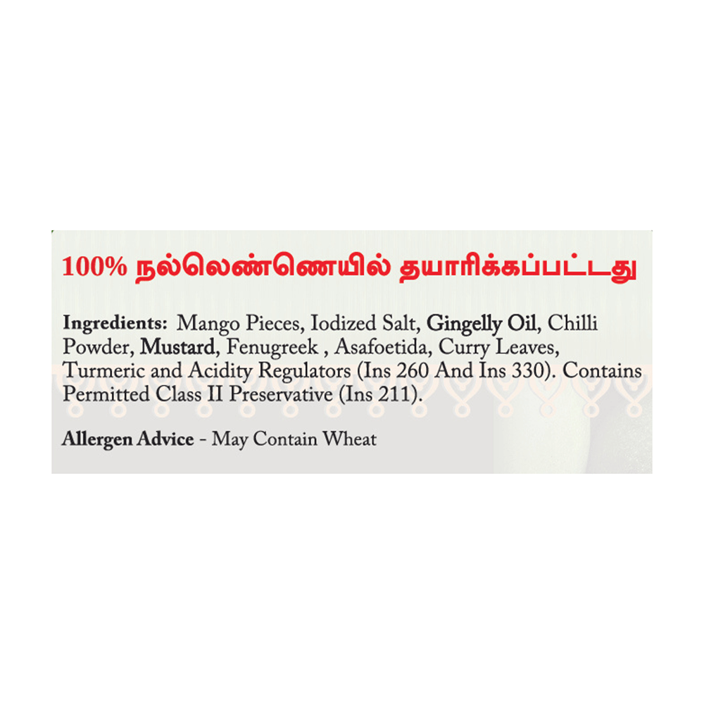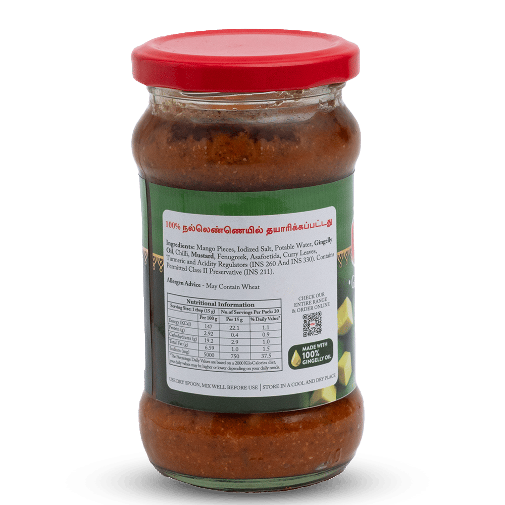 The authentic taste of South Indian raw mangoes, diced, and pickled in oil and spice makes a perfect addition to any plate. Zesty, flavourful, with a tingling blast that hits the back of your throat, there is no substitute for a cut mango pickle.