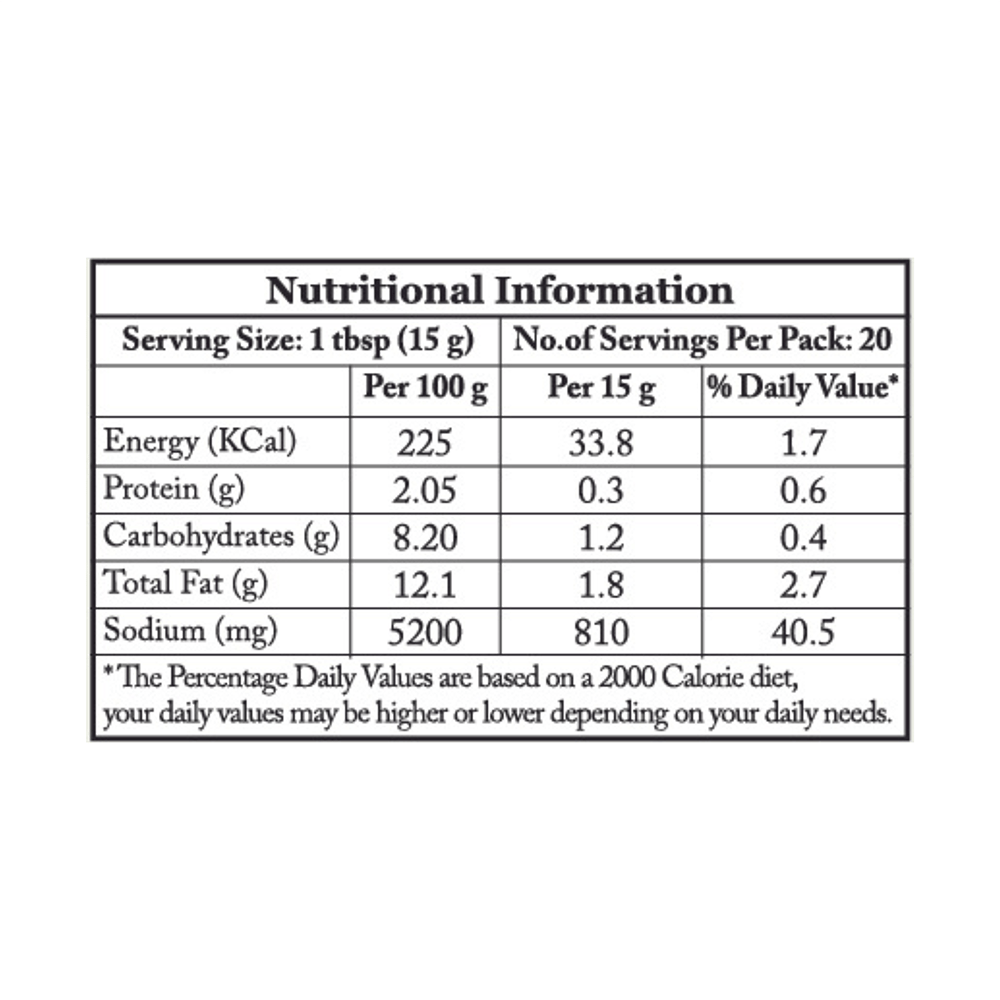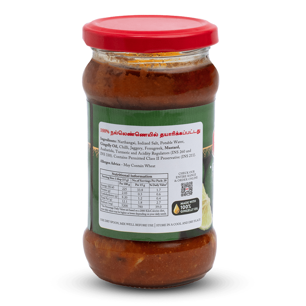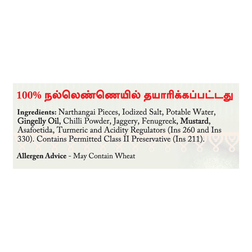 59% Narthangai (Citron) pieces, Salt, Gingelly oil, Sesame oil, Chilli powder, Fenugreek powder, Curry leaves, Mustard, Acidity regulator (E 260), permitted Class II preservatives (E 211)