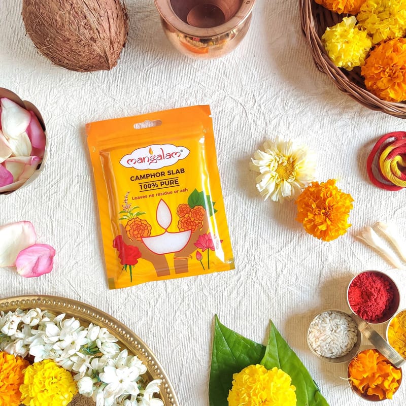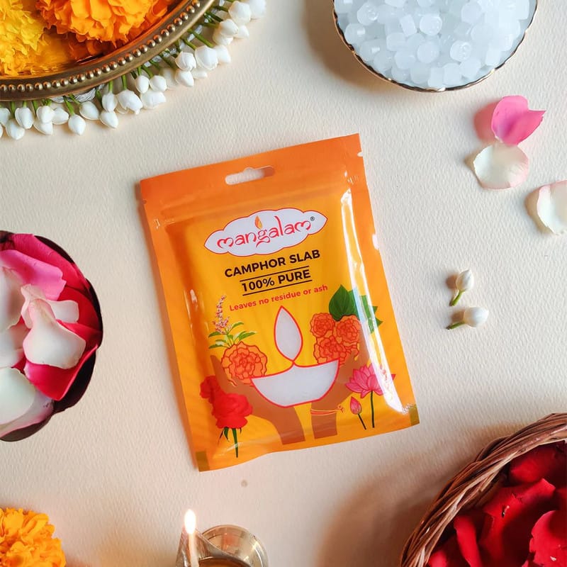 Light a small piece of the Mangalam Camphor Slab for pujas or meditation to experience its purifying effects.