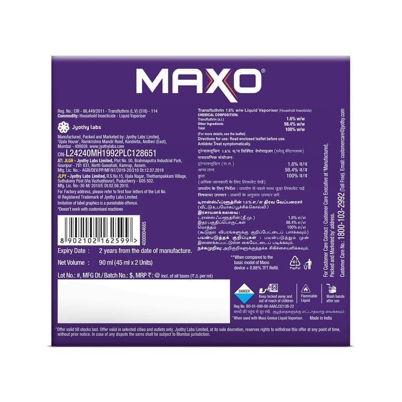 Maxo Liquid Genius is your ultimate protection against mosquitoes, ensuring peaceful, uninterrupted sleep for you and your family. This pack contains two 45-night refills, offering long-lasting defense with every use.