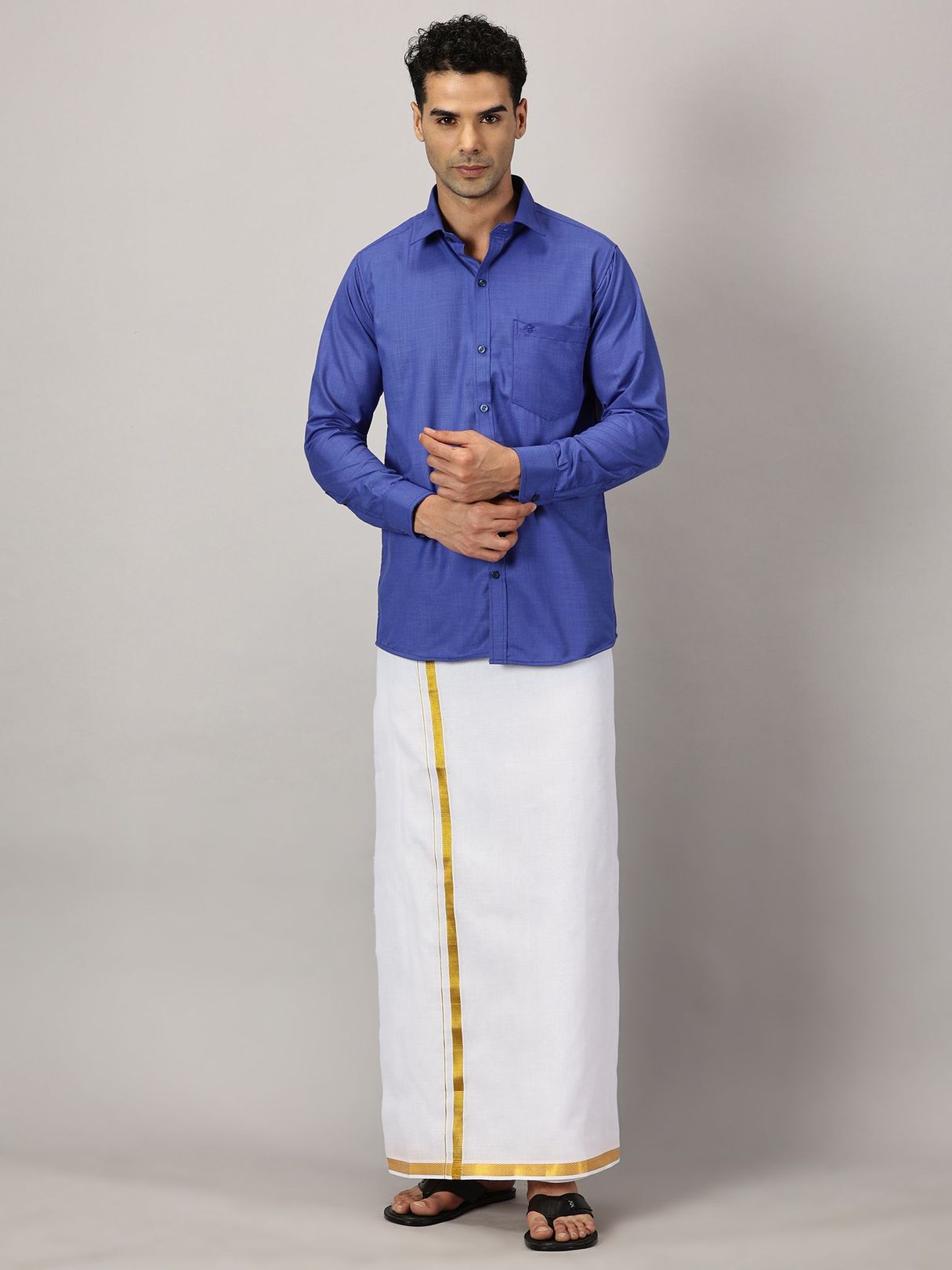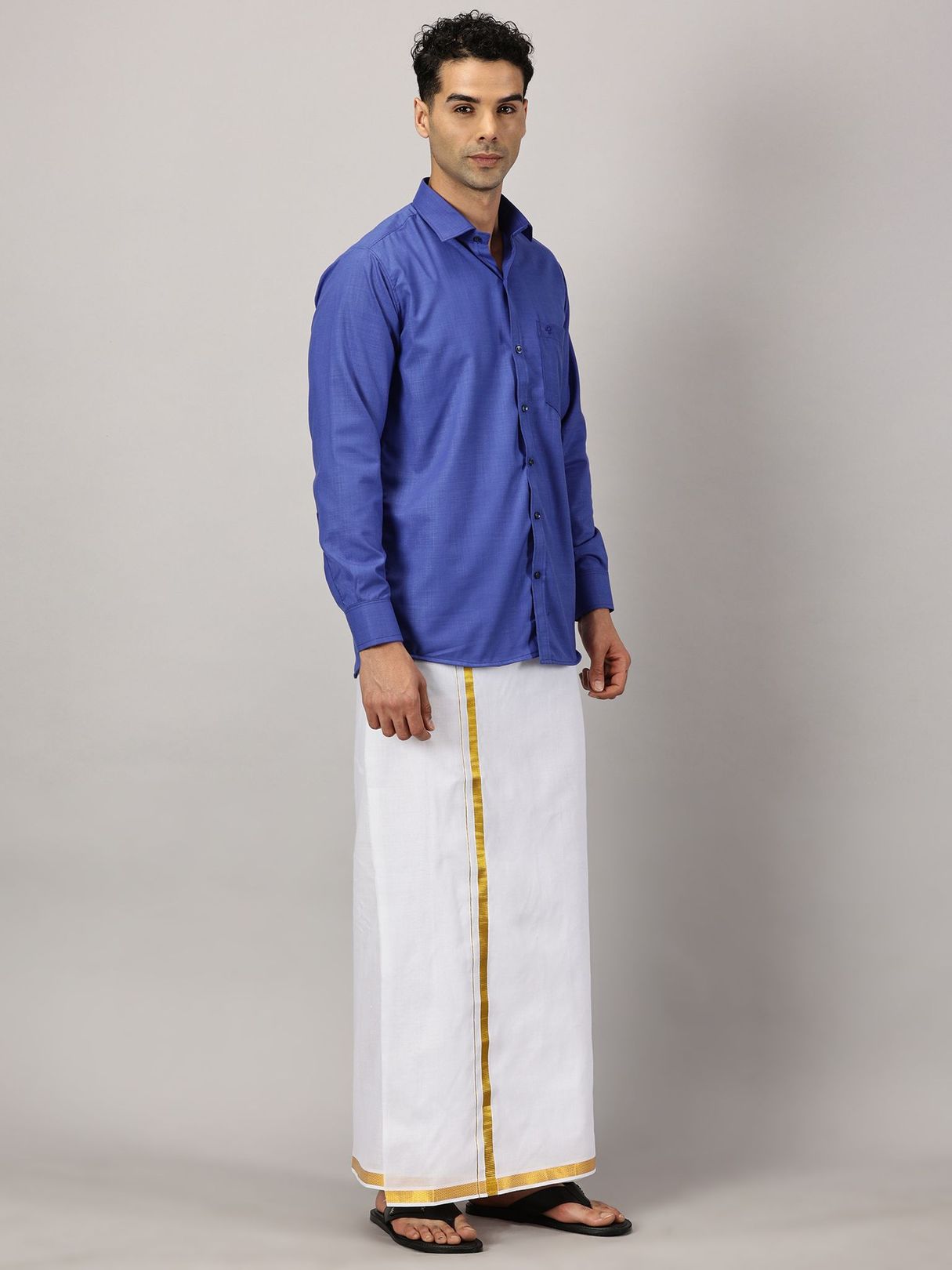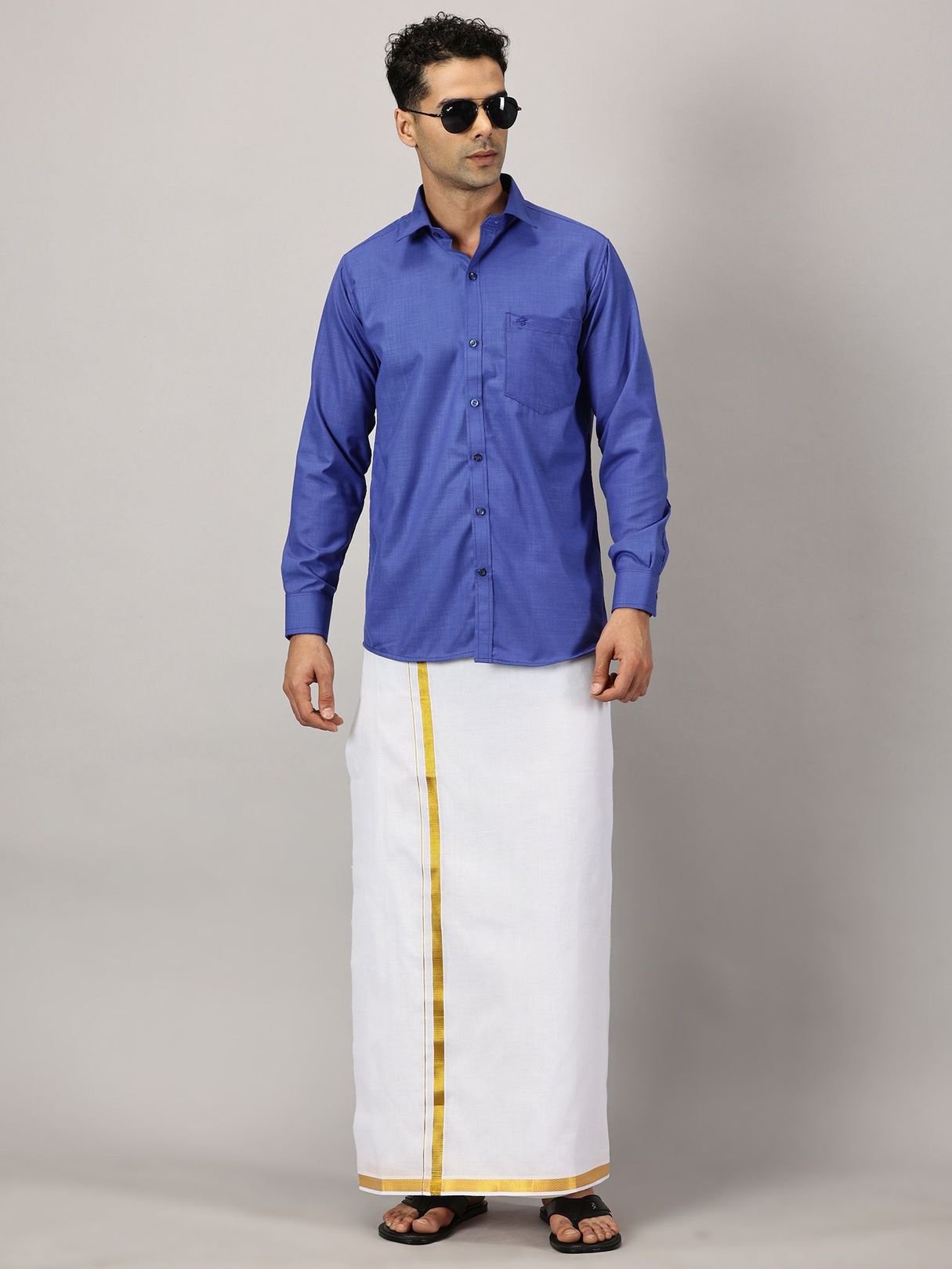 Enhance your festive charm with our Men’s Full Sleeve Shirt Cotton & Dhoti Gold Zari Combo Set in a vibrant cobalt hue. Experience the ease of a full-sleeve shirt paired with a dhoti adorned with gold zari.