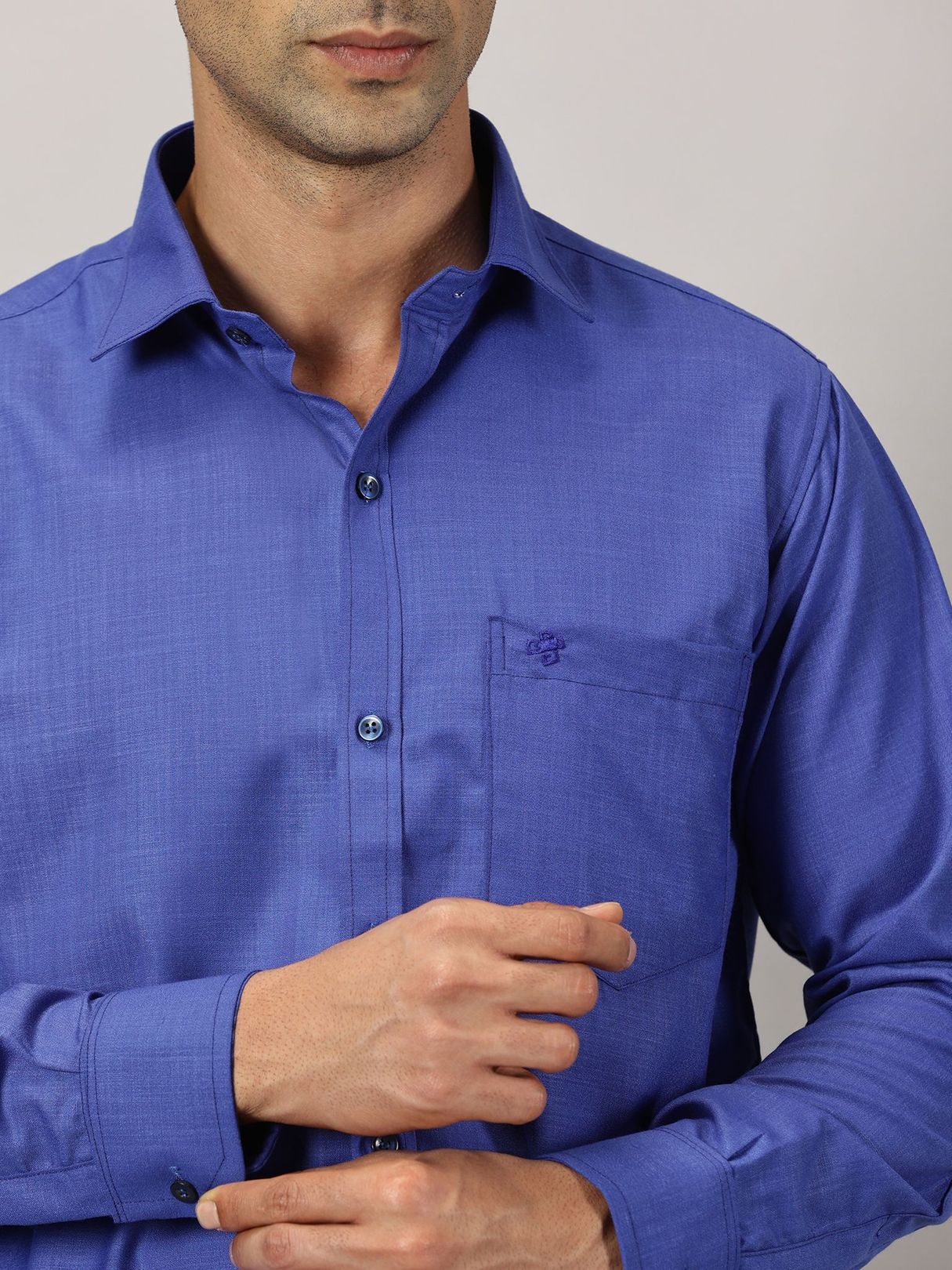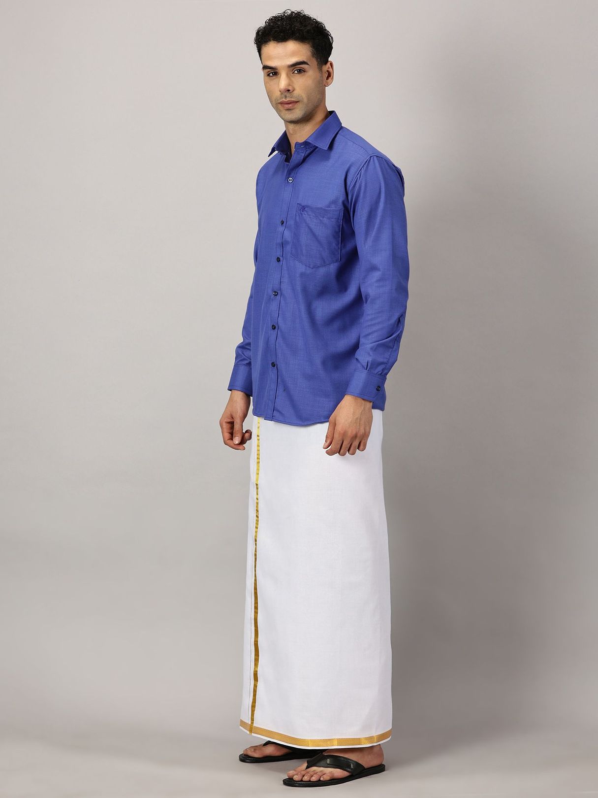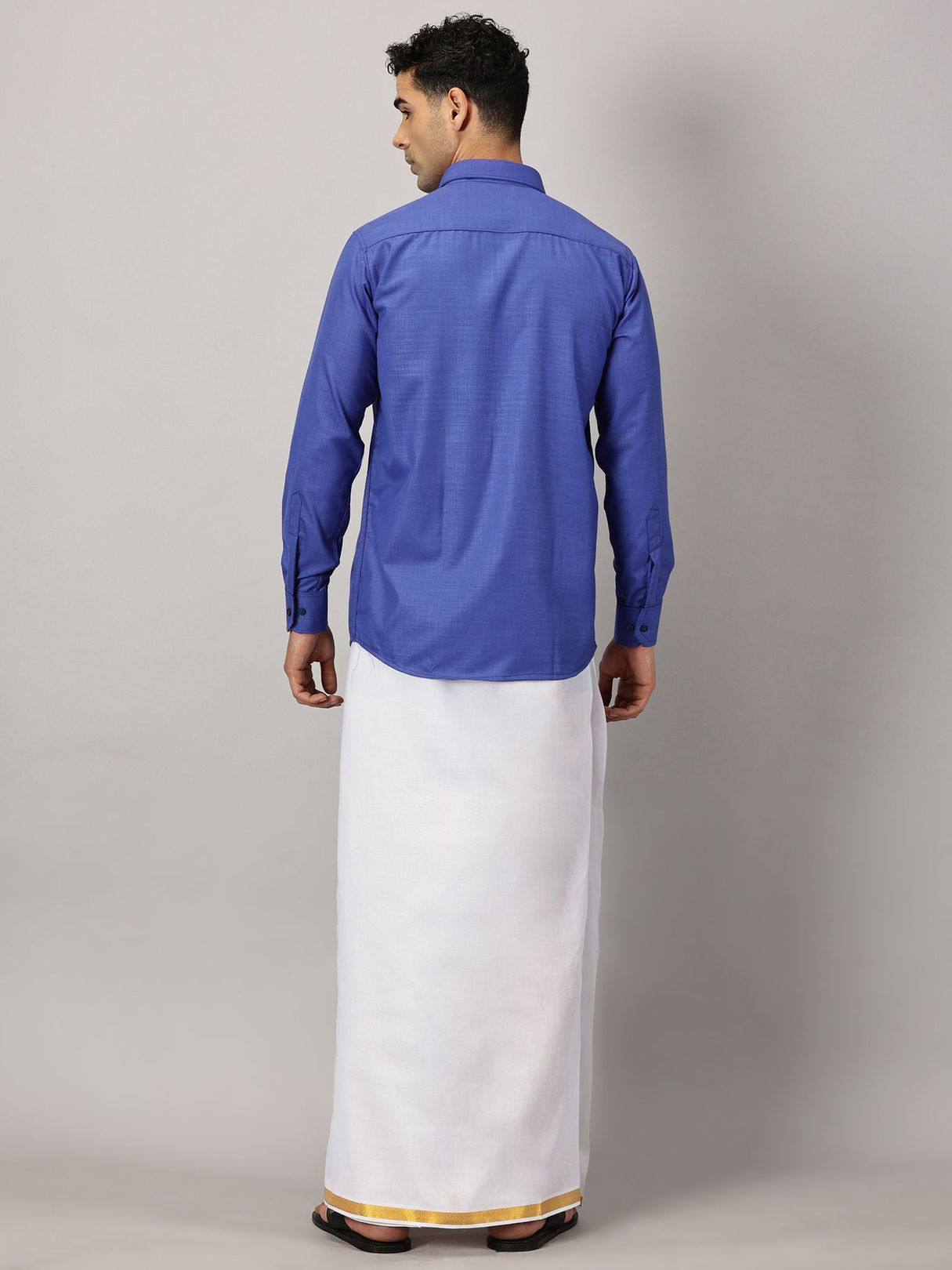 Enhance your festive charm with our Men’s Full Sleeve Shirt Cotton & Dhoti Gold Zari Combo Set in a vibrant cobalt hue. Experience the ease of a full-sleeve shirt paired with a dhoti adorned with gold zari.