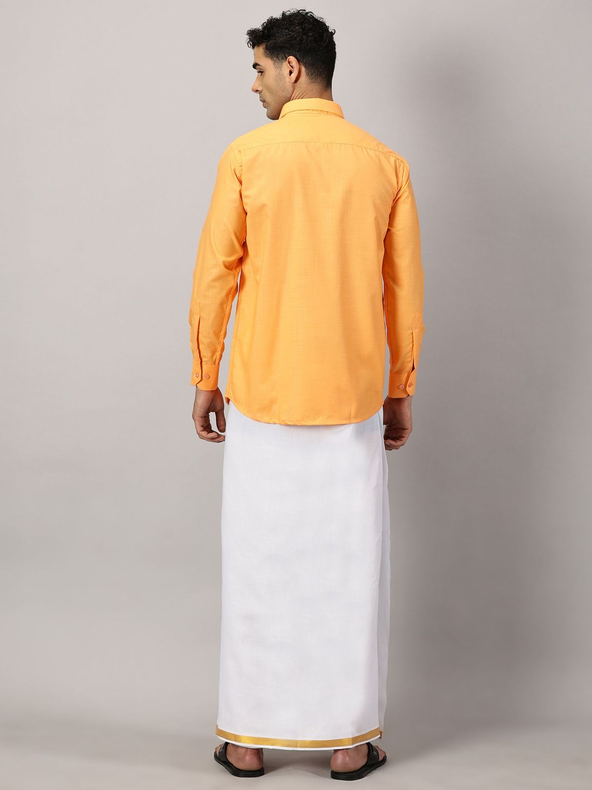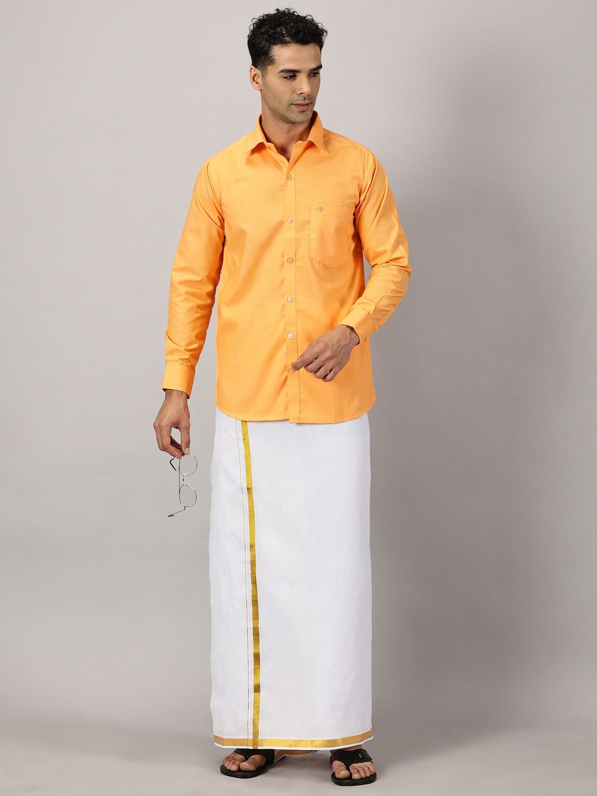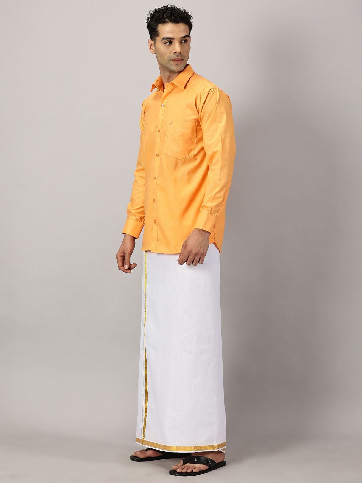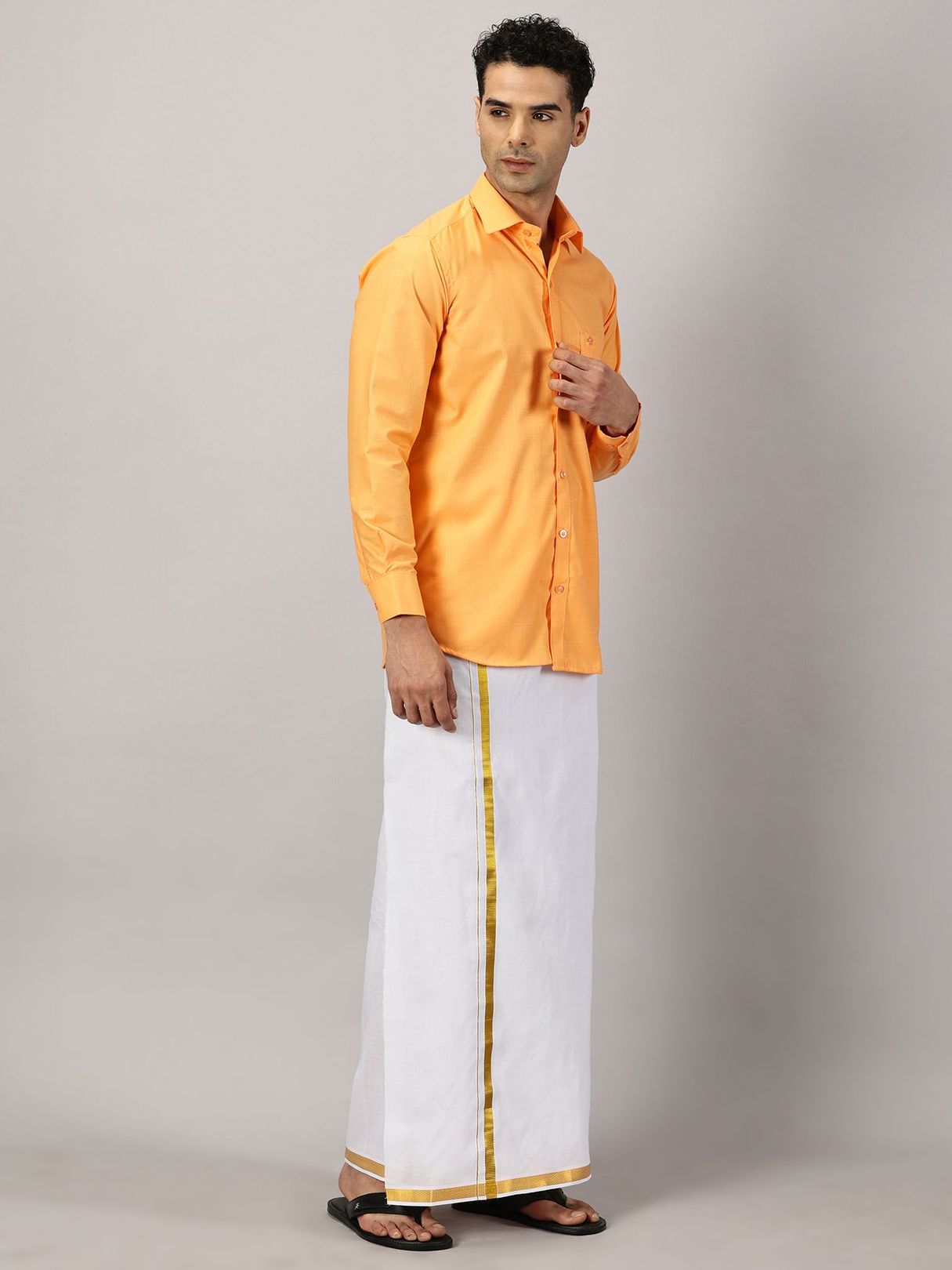 Revamp your festive wardrobe with our Men’s Full Sleeve Shirt Cotton & Dhoti Gold Zari Combo Set in a saffron shade. Immerse yourself in the comfort of a full-sleeve shirt paired with a dhoti adorned with gold zari embellishments.