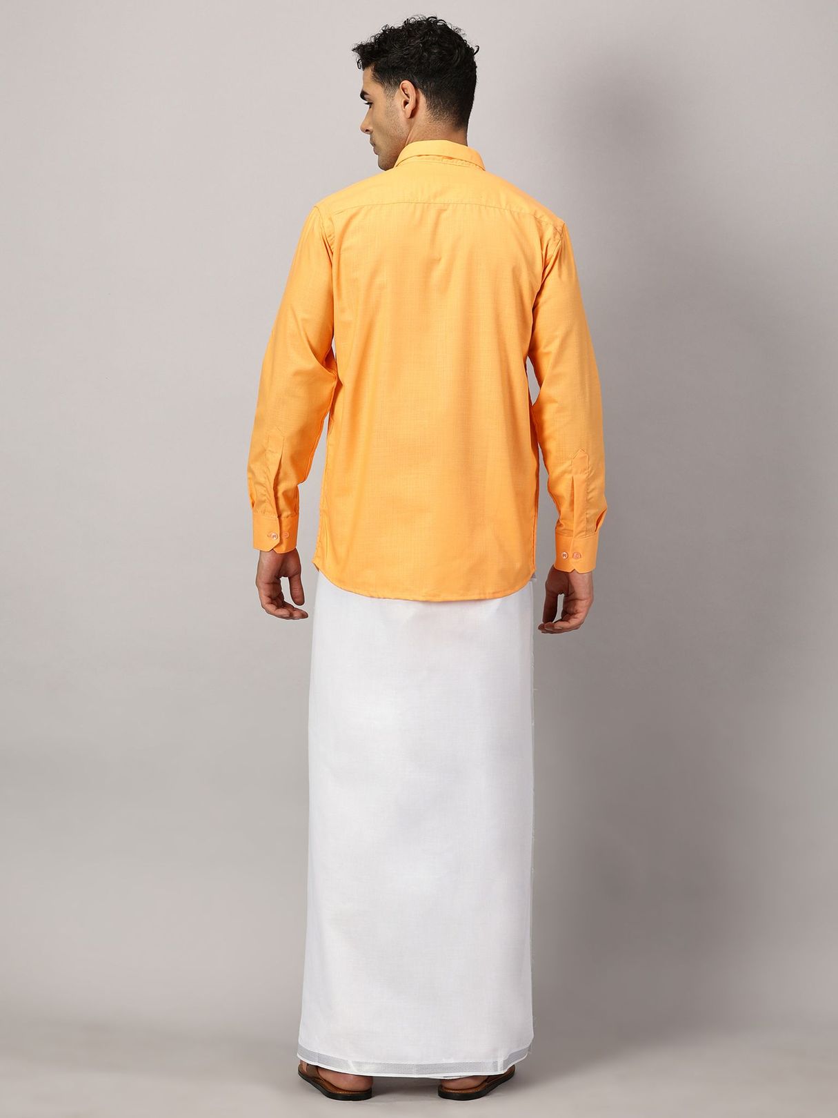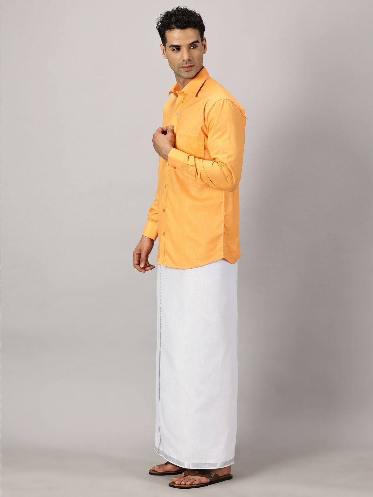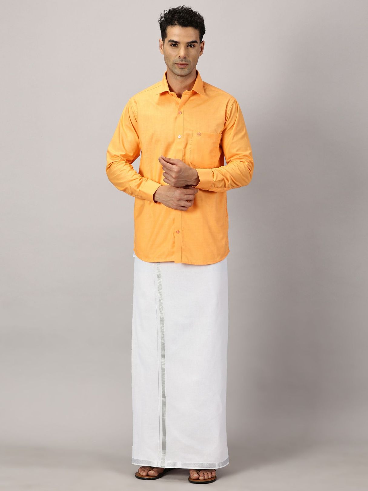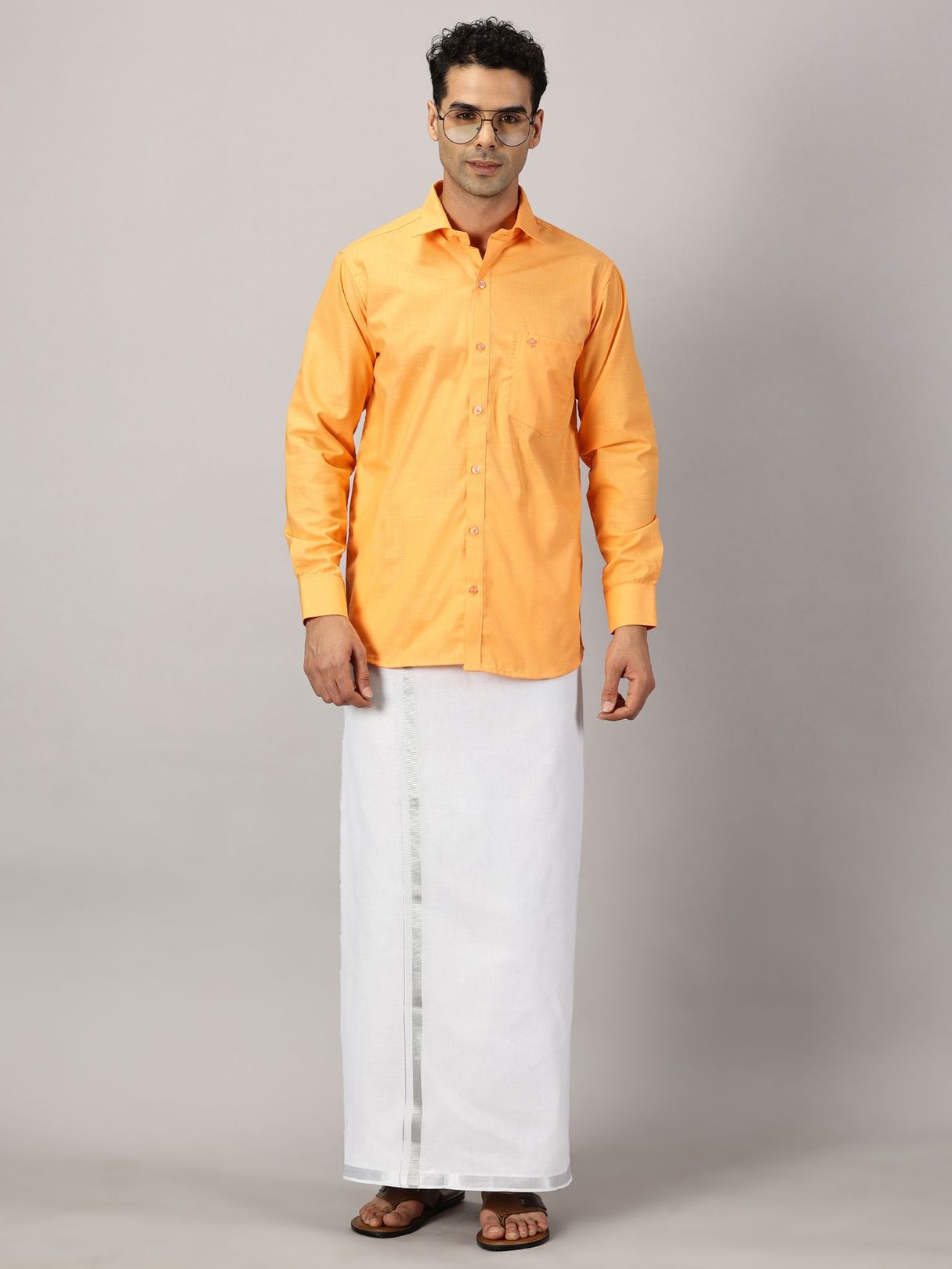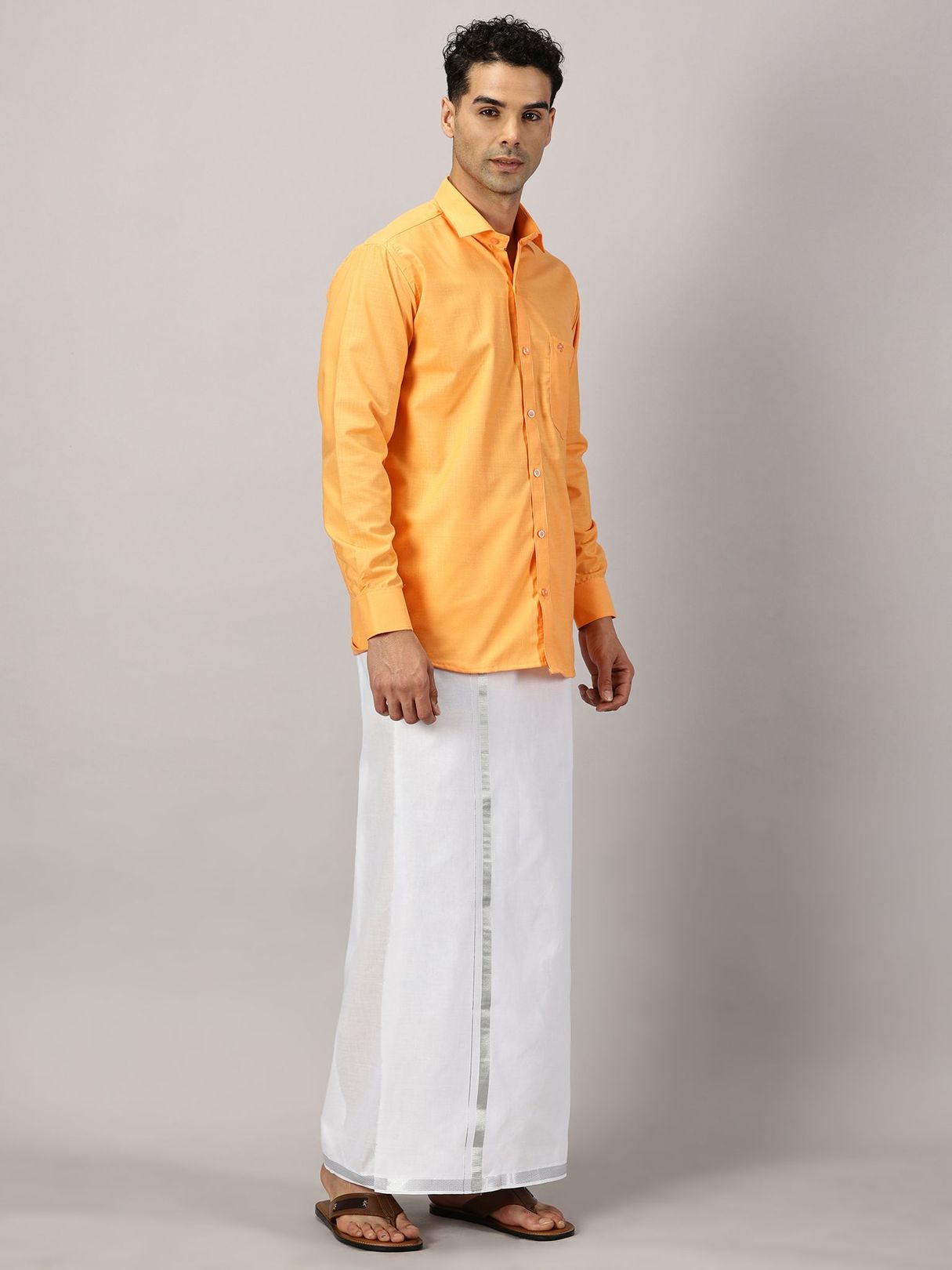 Upgrade your festive style with our Men’s Full Sleeve Shirt Cotton & Dhoti Silver Zari Combo Set in crisp white. Enjoy the ease of a full-sleeve shirt paired with a stylish dhoti featuring intricate silver zari details.