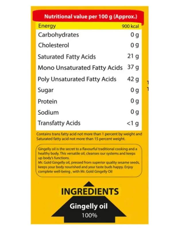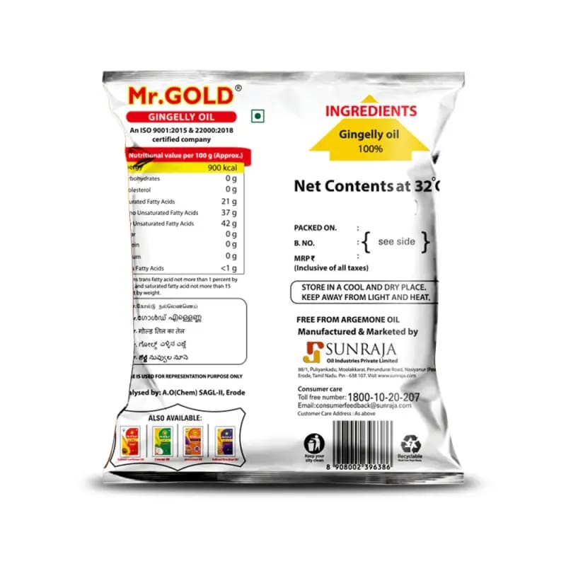 Mr.Gold Gingelly Oil is a premium quality sesame oil, extracted from carefully selected sesame seeds to provide a rich and authentic flavor. Known for its multiple health benefits, this oil is a staple in Indian households, especially for cooking and massages. Its high nutritional content makes it ideal for promoting heart health, boosting digestion, and enhancing skin radiance.