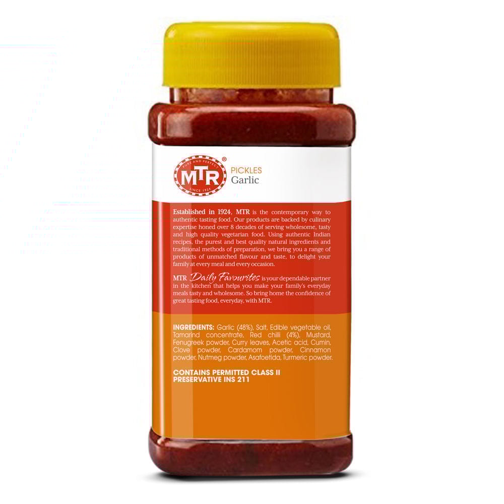 An authentic Indian pickle made from garlic and aromatic spices.