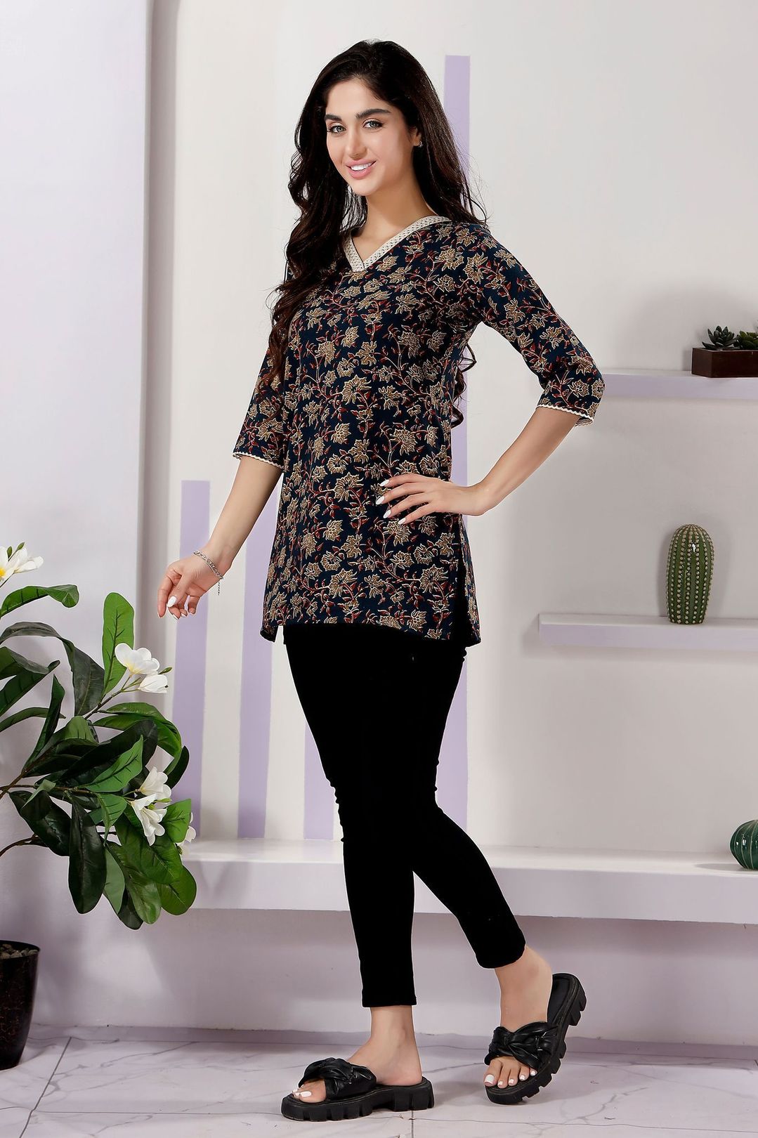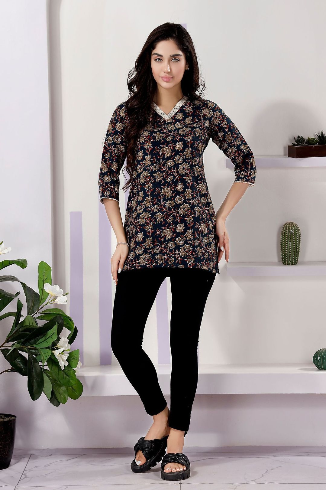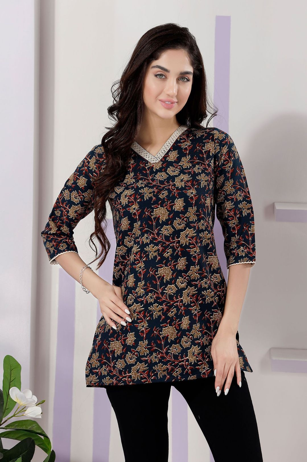 Add a touch of elegance to your wardrobe with our Navy Blue Color V-Neck Kurti. Crafted from premium flex cotton, this kurti ensures both comfort and style. The delicate lace embellishments add a sophisticated flair, making it perfect for both casual and semi-formal occasions. The vibrant tomato hue brings a fresh, lively look, while the V-neck design offers a flattering silhouette. Pair it with your favorite leggings or jeans for a chic and versatile outfit that's sure to turn heads.