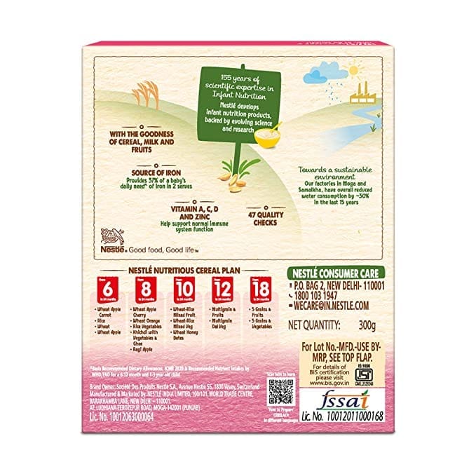 Nestle CERELAC Baby Cereal with Milk, Wheat - Rice Mixed Fruit is a complementary food for babies from 10 to 24 months. While infants and children have higher requirements of nutrients than adults, 2 serves of CERELAC Wheat - Rice Mixed Fruit Cereal provides 37% of a baby s daily need of iron. It is also a source of 14 important nutrients including vitamins and minerals. Nestl develops infant nutrition products backed by evolving science and research. Innovation has been at the heart of Nestl since its beginning. Optimal Preparation: Careful and hygienic preparation of Infant food is most essential for health. Do not use fewer scoops than directed, since diluted feeding will not provide adequate nutrients needed by your infant. Do not use more scoops than directed since concentrated feed will not provide the water needed by your infant. Wash and dry your hands before preparing baby s food. Make sure all utensils are thoroughly clean. Boil clean drinking water for 5 minutes. Allow to cool until lukewarm. Measure the quantity of water as mentioned on the table-1 above and pour it into the baby s bowl. Add the number of scoops of CERELAC as mentioned in the table 1. Stir until the cereal is smooth and feed immediately using a clean spoon. Storage: After opening the pack, the contents should immediately be transferred to an empty, clean, dry and airtight container. Replace the lid tightly after every use and store in a cool, dry place. Ensure enclosed scoop is thoroughly washed and dried before use. After opening, use the contents within 3 weeks or the expiry date, whichever is earlier. Important Notice: Mother s milk is best for your baby. Safety Warnings: Infant food should be used only on the advice of a health worker as to the need for its use and the proper method of its use. Infant food is not the sole source of nourishment for an infant. Use prepared feed within half an hour otherwise microbial deterioration may set in. Discard unused feed.