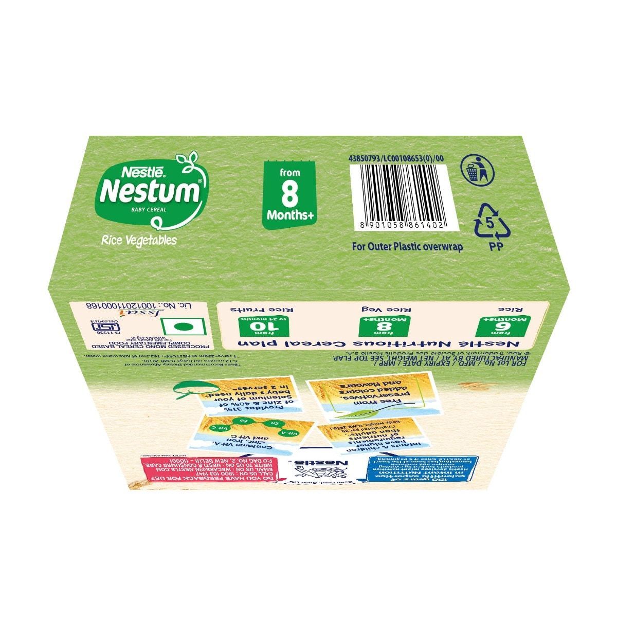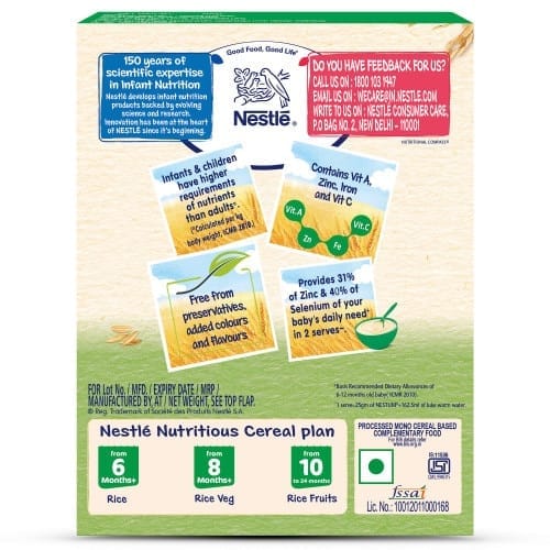 Nestle NESTUM Baby Cereal is a processed mono cereal based complimentary food for babies from 8 months to 12 months. While infants and children have higher requirements of nutrients than adults, NESTUM Rice Vegetables Baby Cereal helps provide 30% of Zinc and 40% of Selenium of your baby s daily needs in 2 serves (1 serve= 25g NESTUM + 162.5ml lukewarm water). This baby growth food is a source of 15 nutrients including vitamins and minerals and contains Vitamin A, Zinc, Iron and Vitamin C. Nestl NESTUM is free from preservatives, added colours, and flavours.Nestl develops infant nutrition products backed by evolving science and research. Innovation has been at the heart of Nestl since its beginning.