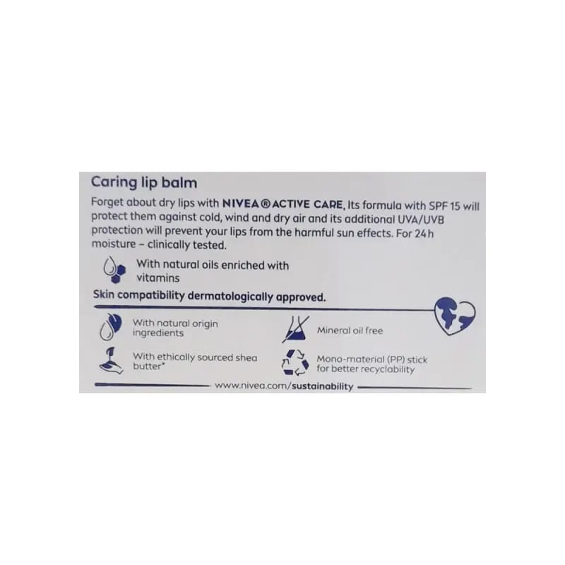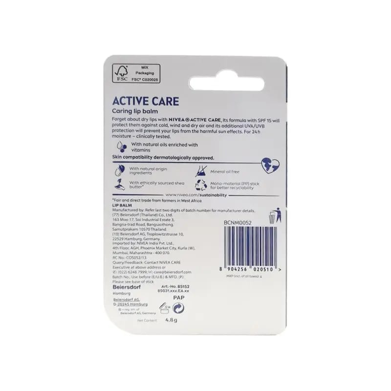 Nivea Men Active Care Lip Balm is specially designed for men to provide intensive care and protection for dry lips. It offers a natural, non-glossy finish and protects lips from harsh environmental conditions. Enriched with SPF 15, this lip balm shields your lips from harmful UV rays, keeping them soft, hydrated, and protected.