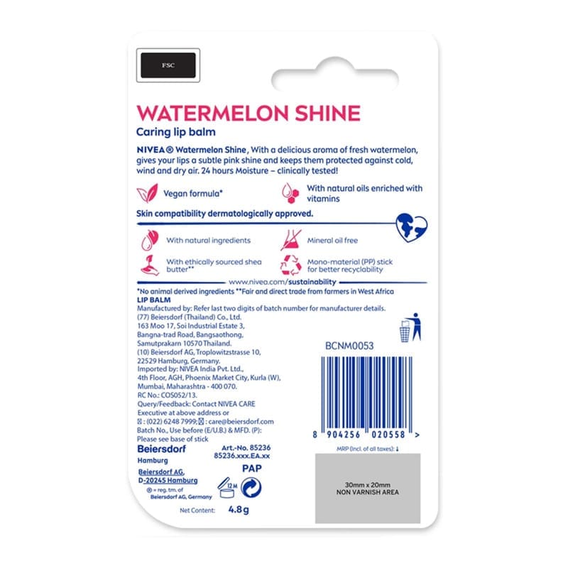 Description: Nivea Watermelon Shine Lip Balm provides a burst of fruity freshness and a subtle tint to your lips. Enriched with the refreshing scent of watermelon, it keeps your lips moisturized while adding a natural shine. Perfect for daily use, this lip balm provides a smooth, soft texture and a long-lasting effect, leaving your lips feeling nourished and cared for. The compact packaging makes it easy to carry around for on-the-go hydration.