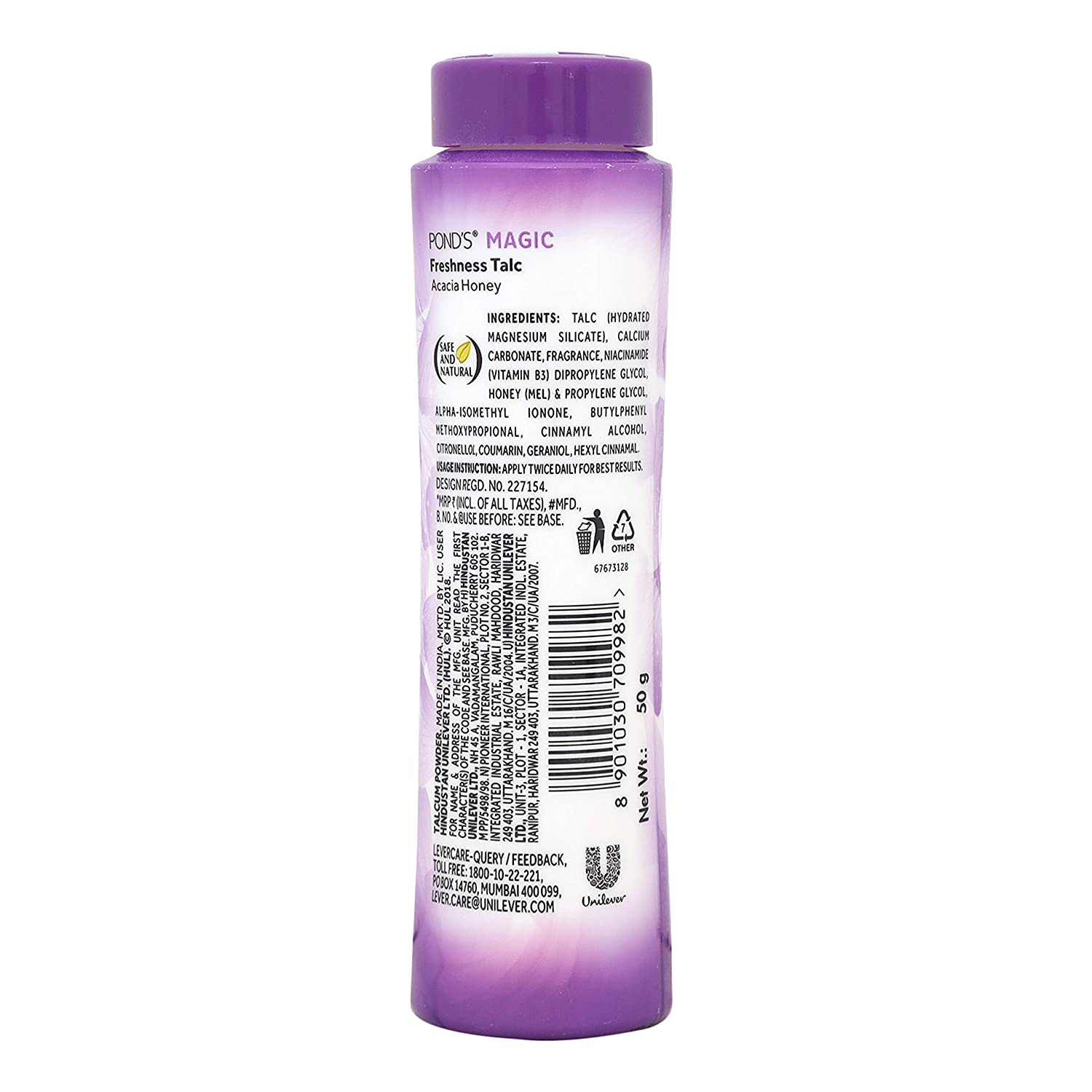 Here's the secret to remain fresh and fragrant all summer Pond s dreamflower magic talcum powder. This powder is formulated to help you stay fresh and pleasant smelling all day. Mesmerize everyone with your sweet fragrance of acacia honey and this talc not only protects you against perspiration but also provides you instant fairness. With its natural ingredients, the powder is safe and gentle on all skin types. The powder is smooth to apply on the body. Come summer, you can forget the stress of mid-day sweats with Pond s dreamflower magic talcum powder. Stay fresh- buy this right away.