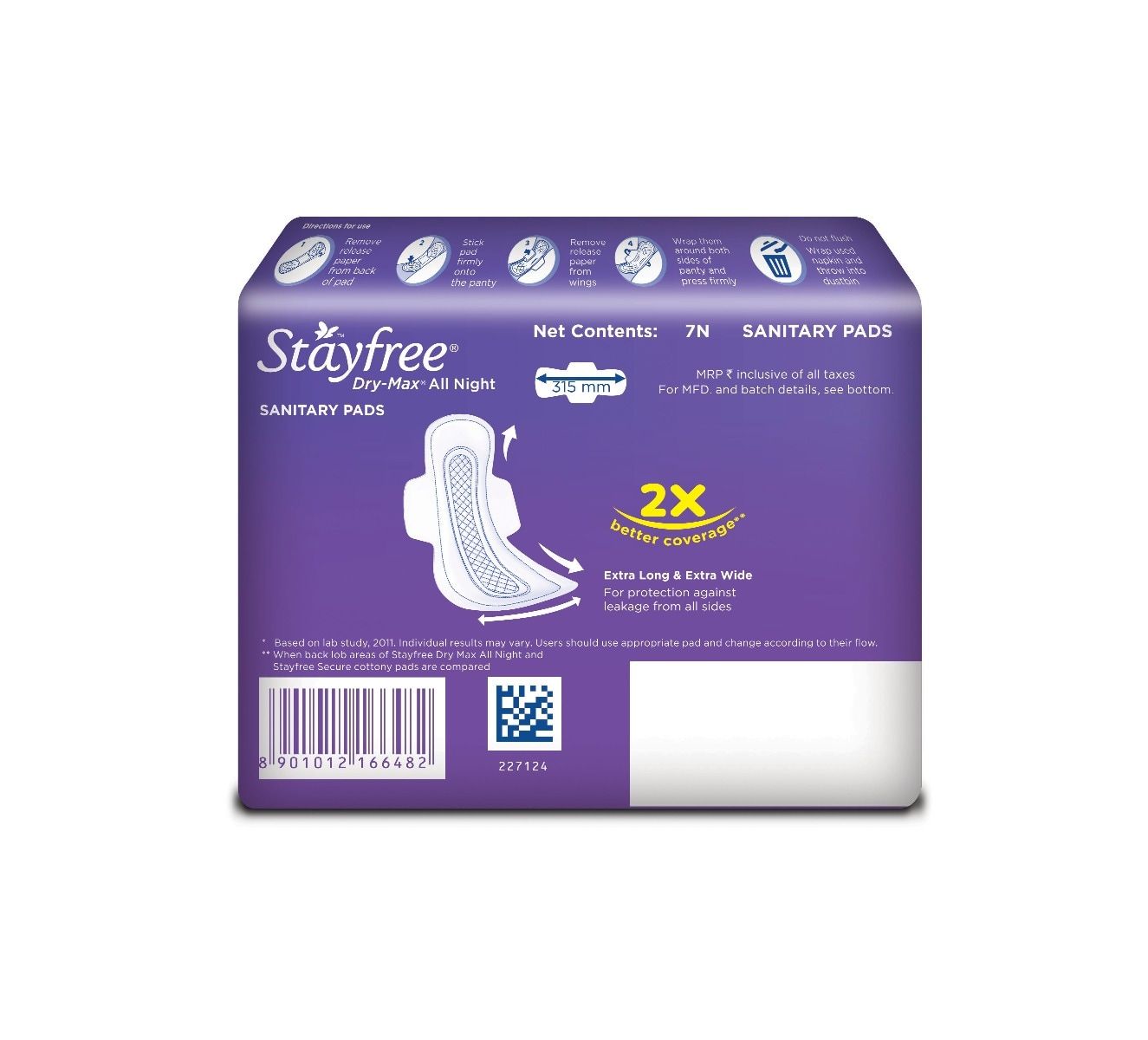 Stayfree Drymax Ultra Thin Pads contains a special cover that lets you keep moving throughout your day while you stay confident and fresh Uses of Stayfree Dry-Max All Night Ultra-Dry Pads With Wings XL, 7 Count Sanitary Pads Key Benefits Perfectly fits your body and stays in place throughout the night Gives you a superior comfort Made for Regular to Heavy periods Nearly 40% longer, for long-lasting protection Odour Control System: Prevents odour and keeps you fresh and confident all day Super Absorb Design: Absorbs more and helps prevent leaks Size: Regular