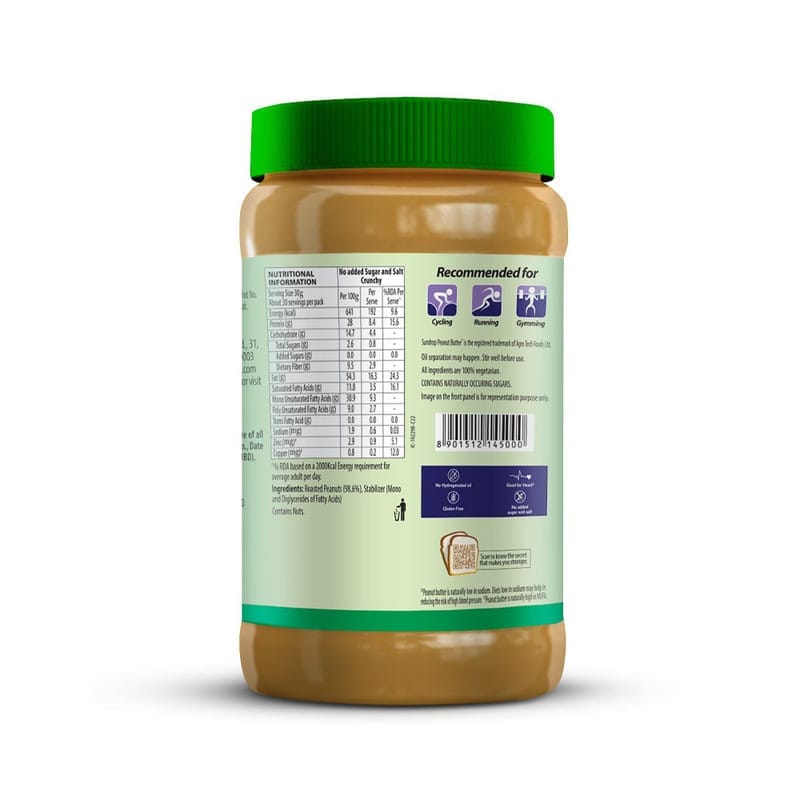 Sundrop Peanut Butter Crunchy No Added Sugar & Salt is a wholesome spread made from 100% roasted peanuts. With its crunchy texture and pure nutty taste, it s a healthy and delicious choice for fitness lovers, kids, and anyone looking for a nutritious snack without unnecessary additives.
