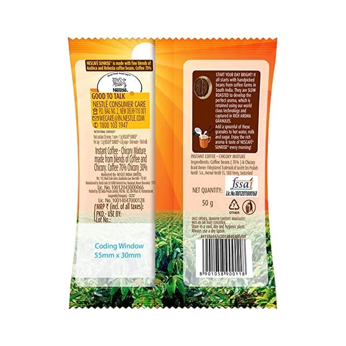 "Nescaf Sunrise is an instant coffee-chicory mixture made from blends of 70% coffee and 30% chicory. This coffee is made with the fine blends of Arabica and Robusta beans, which are slow-roasted for optimal flavour. Awake your senses with the rich aroma and taste of Nescaf Sunrise every morning. It all starts by handpicking the best beans from coffee farms in South India. They are slow roasted in rotating drum roasters till they develop the perfect aroma. Nestle s world class technology then ensures this aroma is retained all through the coffee making process and finally capture in aroma granules. Usage: Simply follow the instructions on the back of the pack and mix the coffee granules to hot water, sugar and milk to release the rich aroma in your cup every morning. Storage Recommendation: On opening, transfer the contents of the pack into an airtight container. Always use a dry spoon"