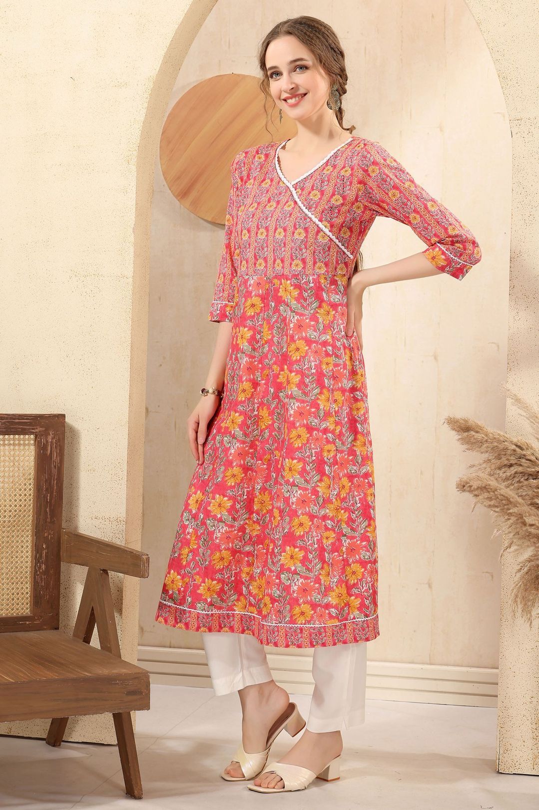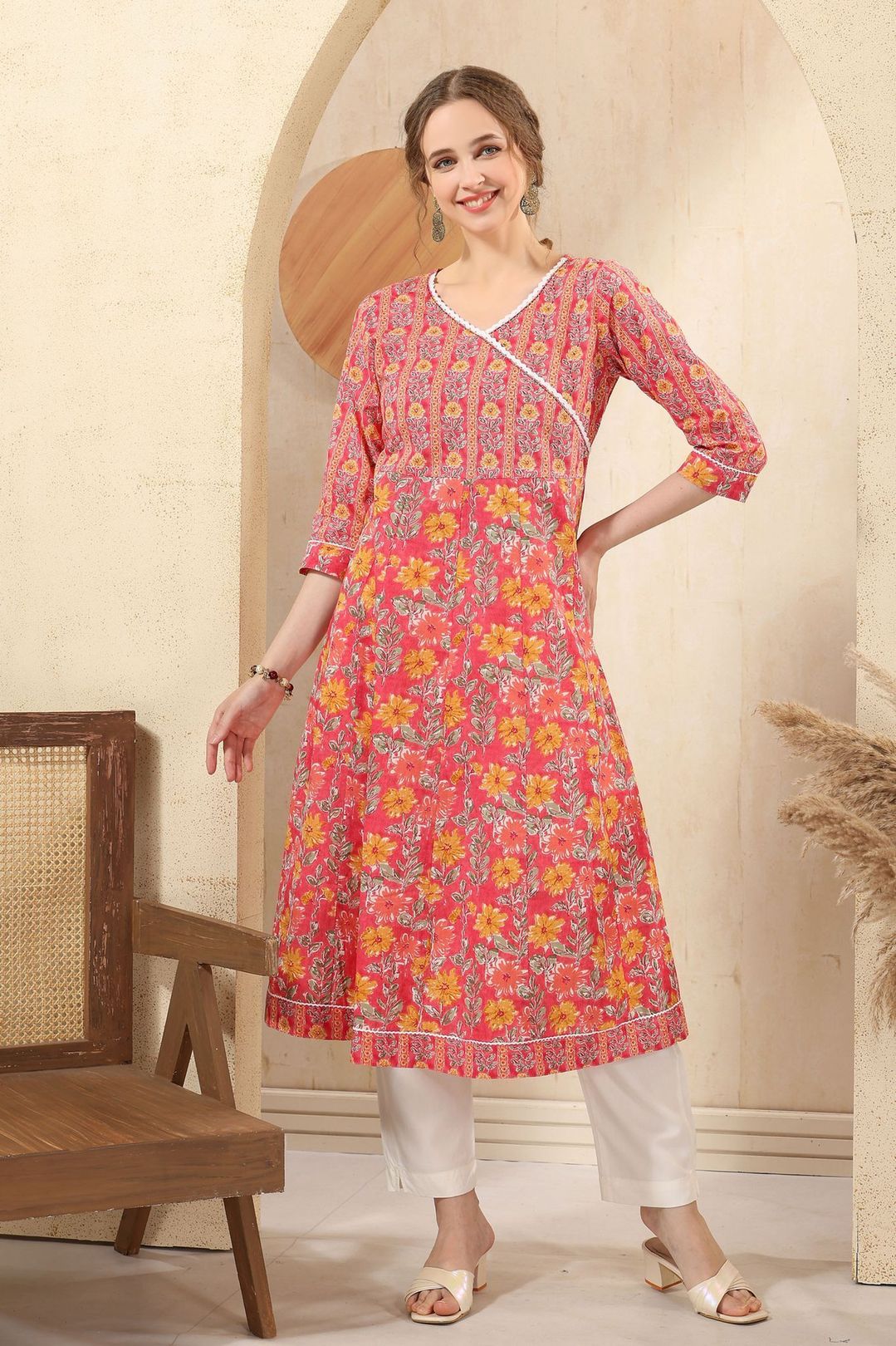Tomato Jaipuri Cotton Print Anarkali For Women With Laces Embellishment. V Neck and Beautiful Mix-n-Match print makes it exclusive and party wear.