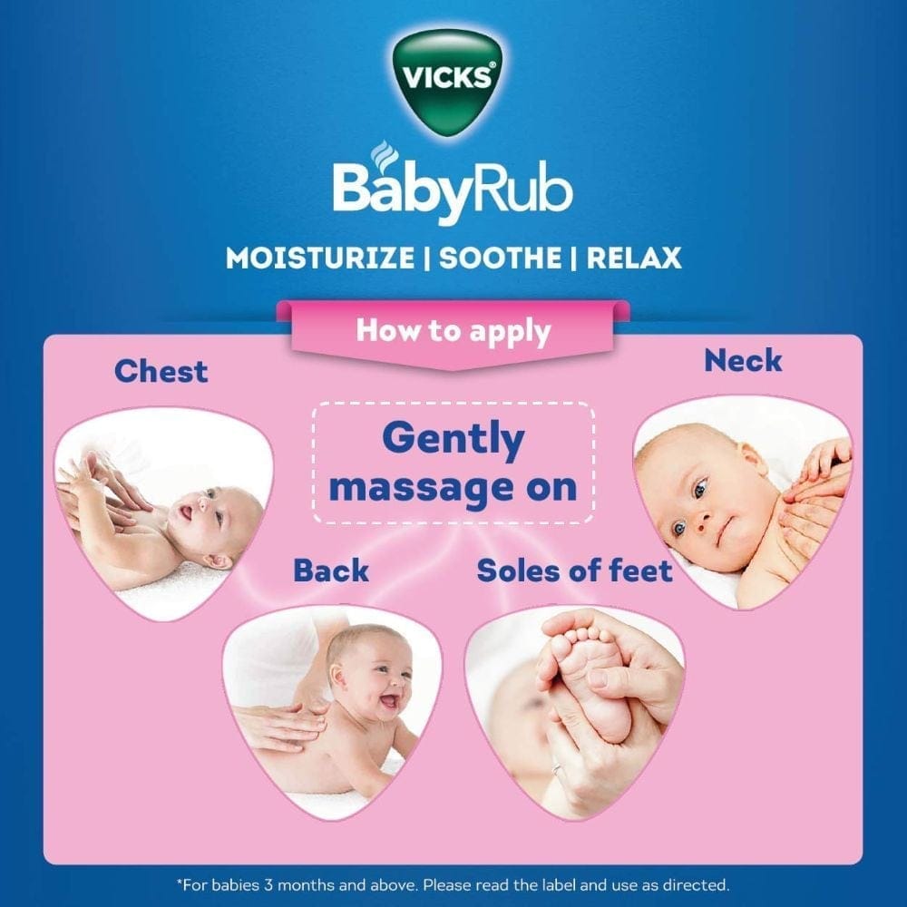 Introducing NEW Vicks BabyRub ? specially developed for your baby in association with baby and skin experts. It contains aloe vera, coconut oil and fragrances of lavender & rosemary. Together with your loving touch, it helps to gently moisturize, soothe and relax your baby. A good babyrub massage can help your baby?s skin retain moisture and stay soft, making your baby feel more comfortable. Specially developed in association with baby and skin experts, Vicks babyrub is suitable for babies 3 months and above. It has a long history in USA, Canada, Australia and New Zealand. With millions of packs sold, moms worldwide have trusted Vicks BabyRub for their babies.