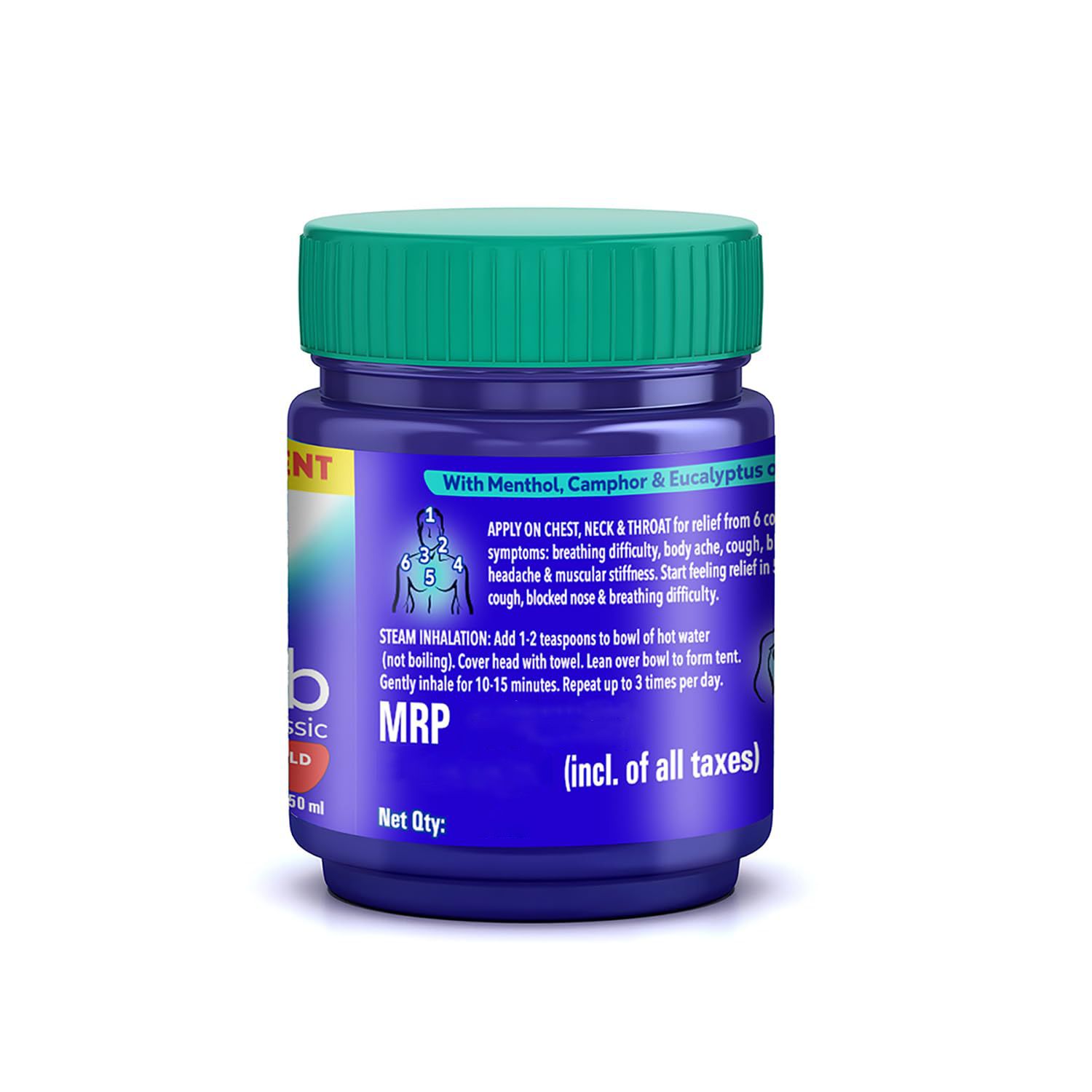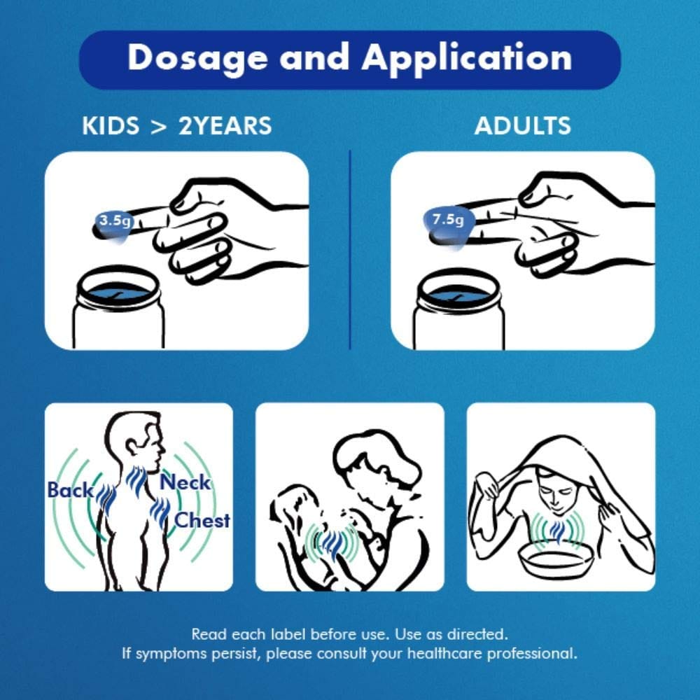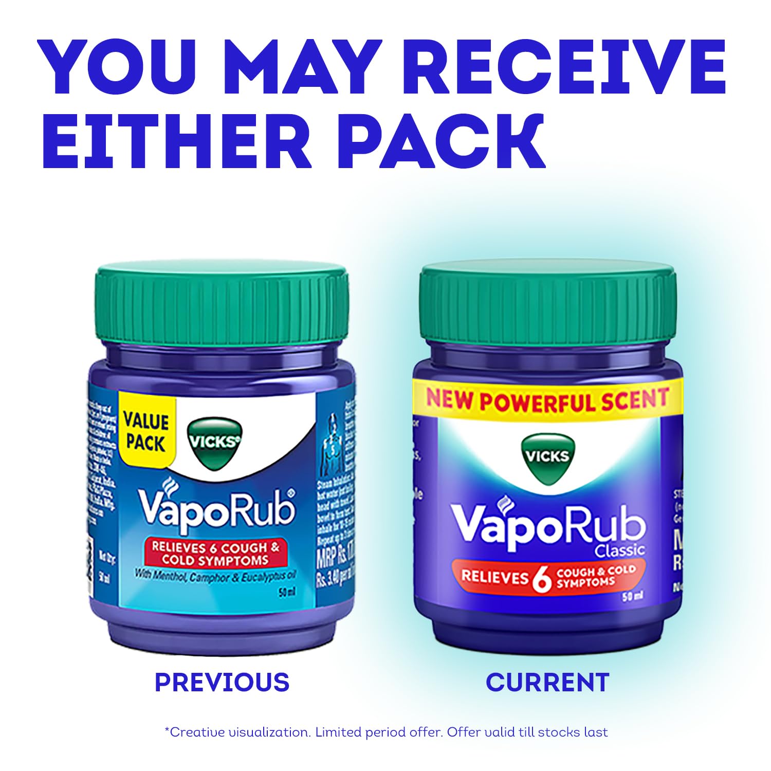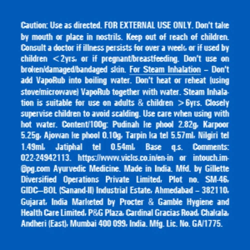 Vicks VapoRub contains Menthol, Camphor and Eucalyptus Oil, known for their therapeutic benefits in cough and cold relief. It provides effective multi-symptom relief from 6 symptoms- Blocked nose, Breathing difficulty, Cough, Body Ache, Headache & Muscular stiffness Directions: Apply on chest, throat and back for relief from 6 cold symptoms: Breathing difficulty, body ache, cough, blocked nose, headache and muscular stiffness. Start feeling relief in 5 minutes from cough, blocked nose and breathing difficulty. Steam Inhalation: Add 1-2 teaspoons to bowl of hot water (not boiling). Cover head with towel. Lean over bowl to form tent. Gently inhale for 10-15 mins. Repeat up to 3 times per day. Ingredients: Content/100g: Pudinah Ke phool 2.82g, Karpoor 5.25g, Ajowan Ke Phool 0.10g, Tarpin Ka Tel 5.57ml, Nilgiri Tel 1.49ml, Jatiphal Tel 0.54ml, Base q.s. Caution: ?Use as directed. For external use only. ?Don?t take by mouth or place in nostrils. Keep out of reach of children. ?Consult a doctor if illness persists for over a week, or if used by children less than 2 years or if pregnant /breastfeeding. Don?t use on broken / damaged / bandaged skin. ?For Steam Inhalation ? Don?t add Vaporub into boiling water. Don?t heat or reheat (using stove /microwave) Vaporub together with water. Steam inhalation is suitable for use on adults and children more than 6 years. Closely supervise children to avoid scalding. Use care when using with hot water.