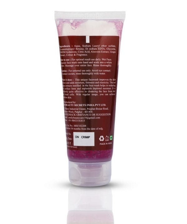 Ingredients: Aqua , Sodium Lauryl ether sulfate , Cocamidopropyl Betaine, Di sodium EDTA, Glycerine , DMDM hydantoin, Citric Acid, Aloevera Extract, Grape Extract Colour & Fragrance