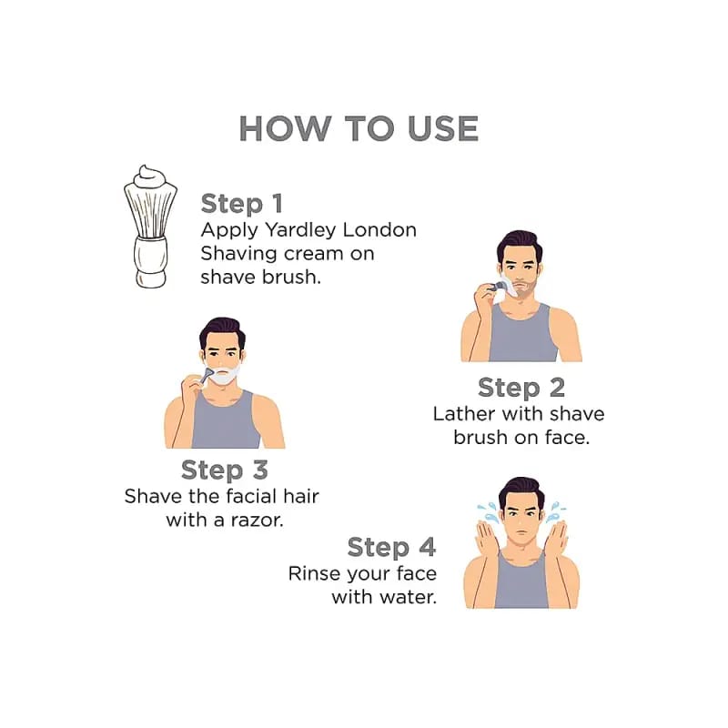 Apply a small amount of shaving cream onto a wet face or shave brush. Gently massage in circular motions to create a lather. Shave as usual and rinse with warm water.