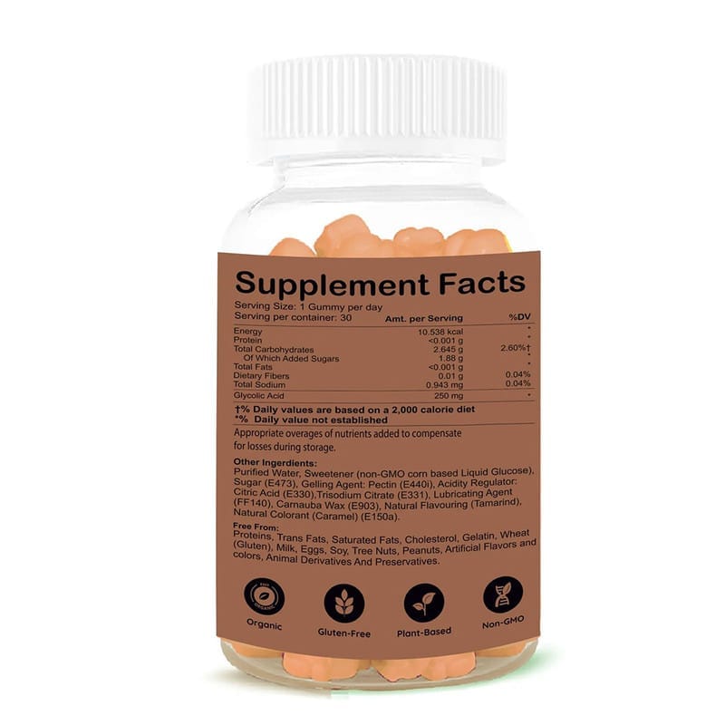 Glycolic acid is known for its exfoliating properties that work at the cellular level to remove dead skin cells and unclog pores. Tamarind is naturally rich in tartaric acid and antioxidants, which further support brightening and anti-aging effects making this duo a skincare game-changer in a gummy form.