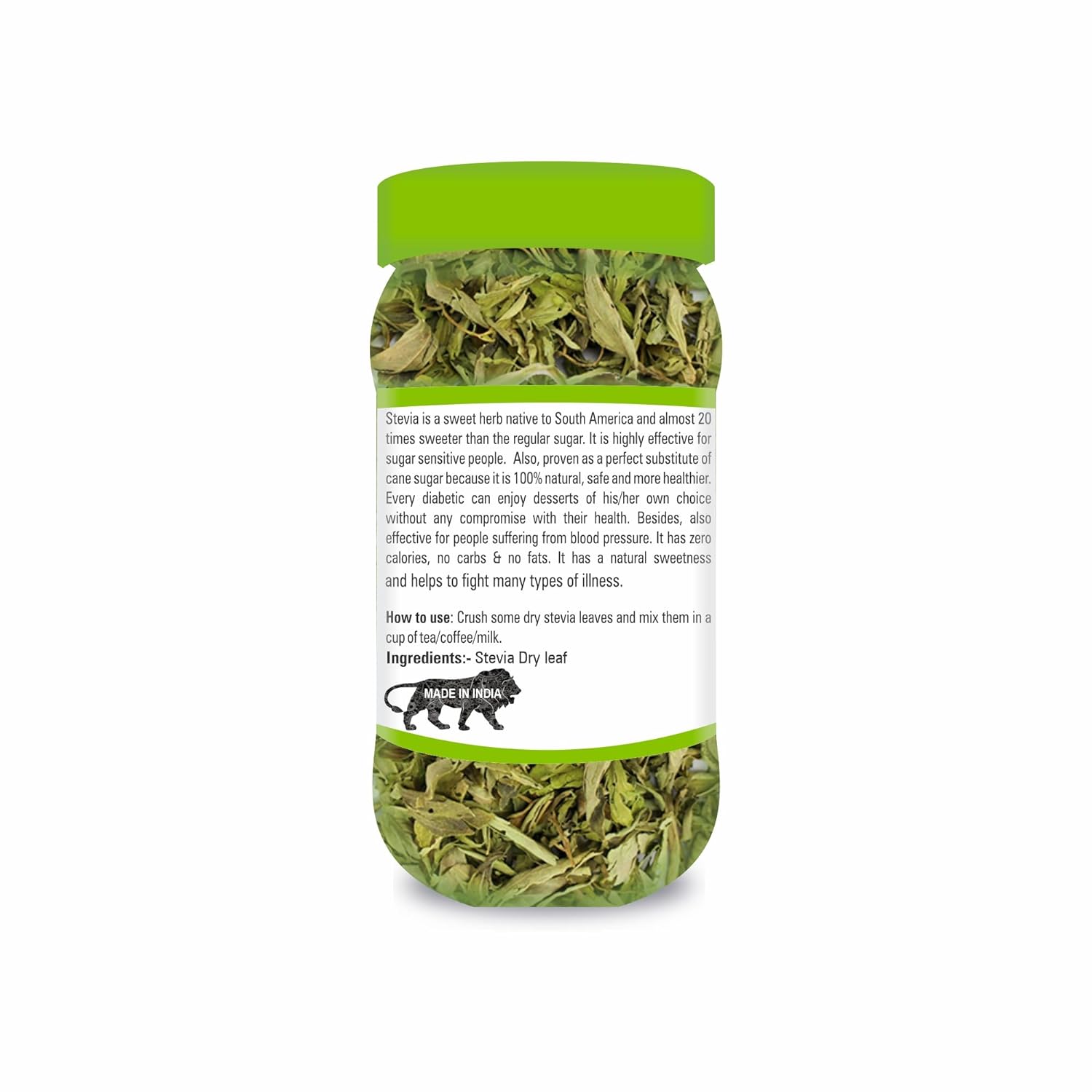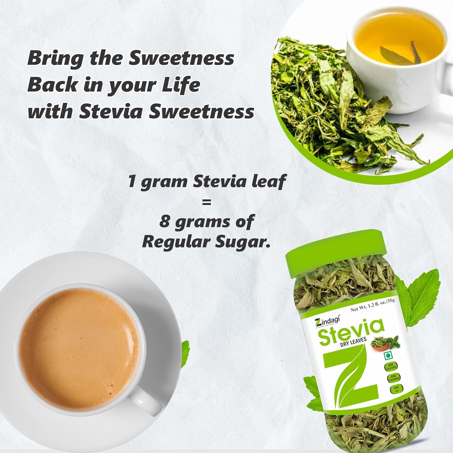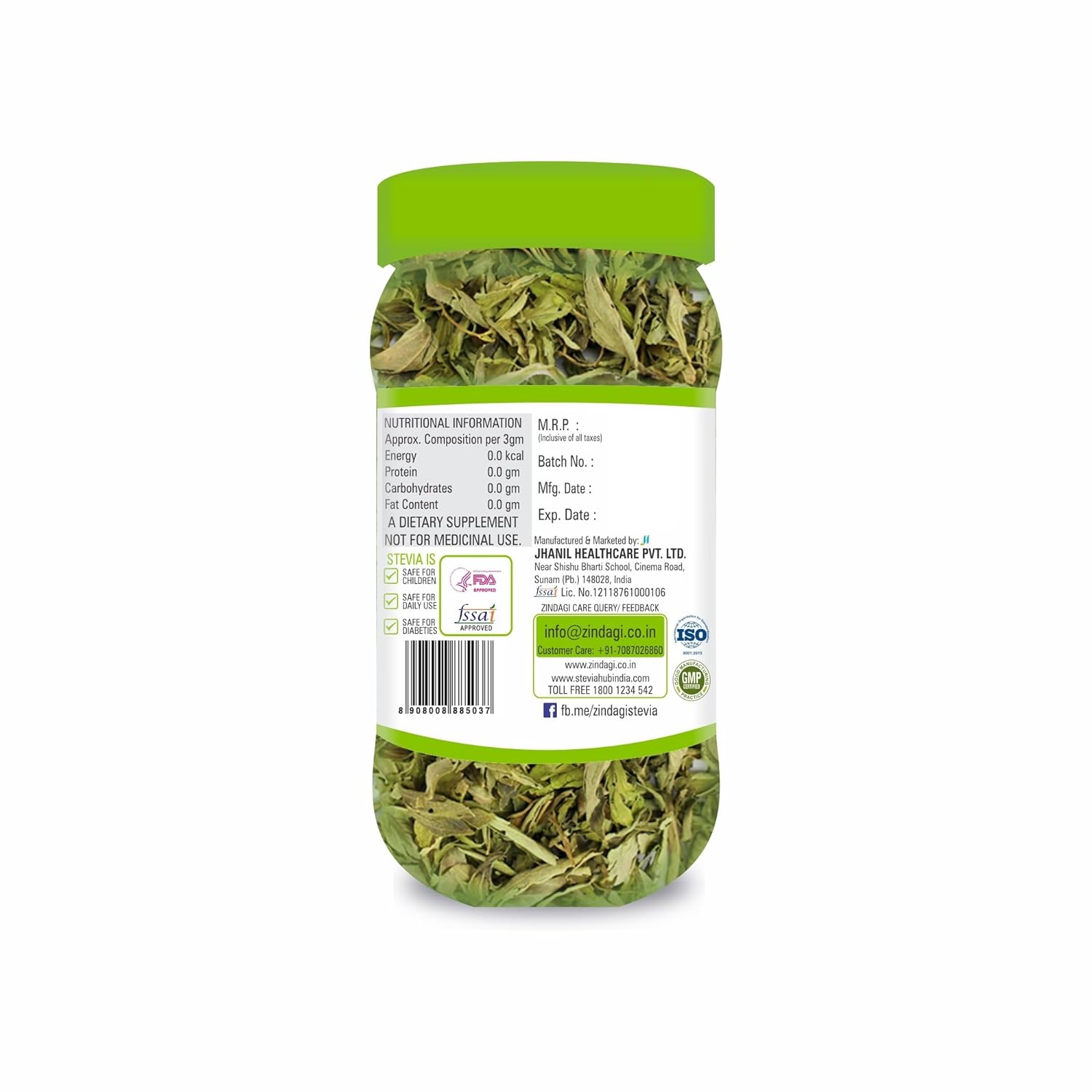 ZINDAGI STEVIA zero sugar is a 100% natural sweetener. It is Diabetic friendly sweetener, It is very helpful to reduce calories. It contains only dry Dtevia leaves which is a 100% natural herb. It blends easily in any sweet thing, It can be cooked and baked. Stevia is the best substitute of refined sugar. Unlike other sweeteners it does not contain any artificial sweeteners and chemicals like ASPARTAME, SUCRALOSE and LACTOSE. Stevia sweetener is safe for children, pregnant woman and for daily use. Material feature: Vegetarian, Shelf life: 24 months.