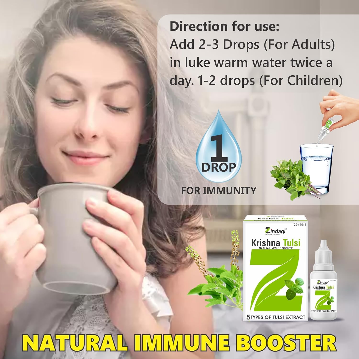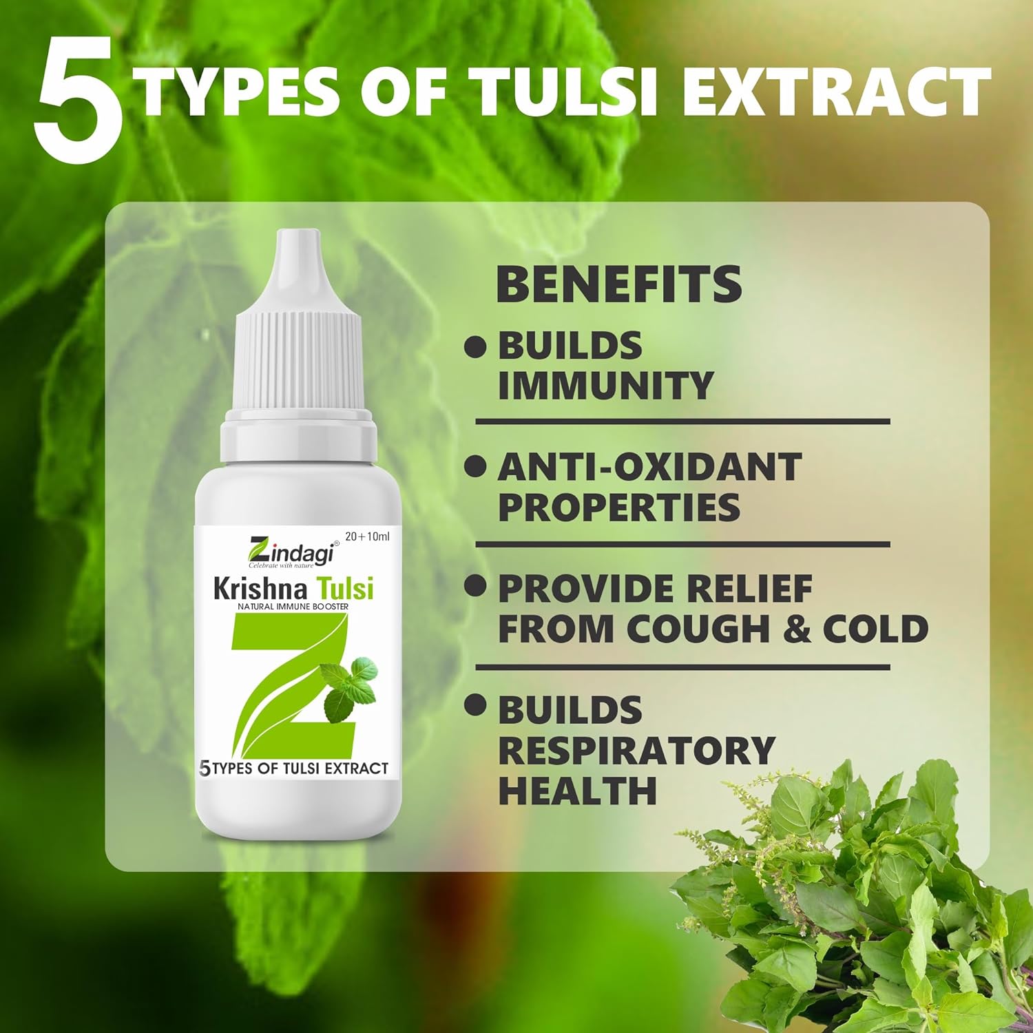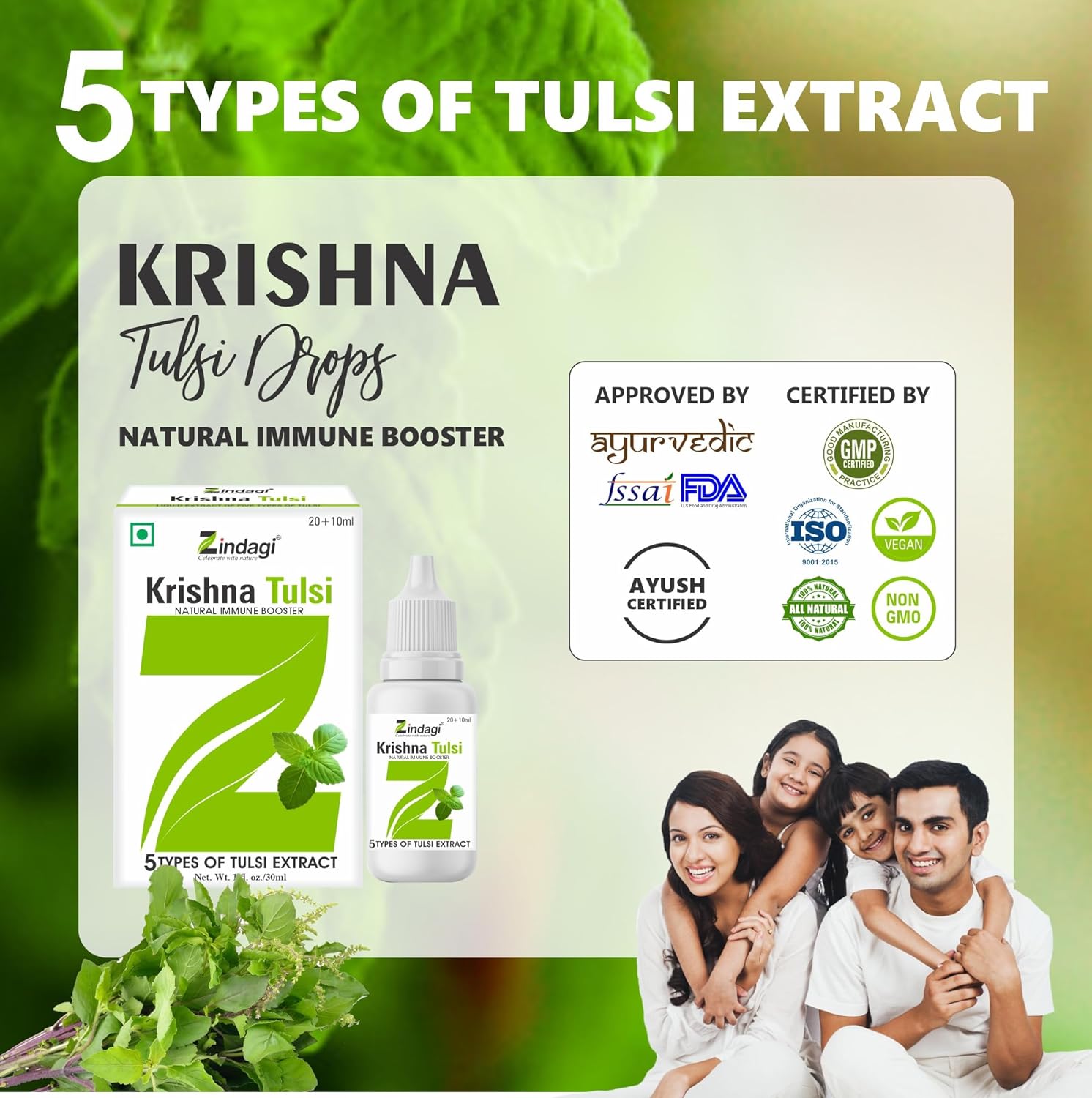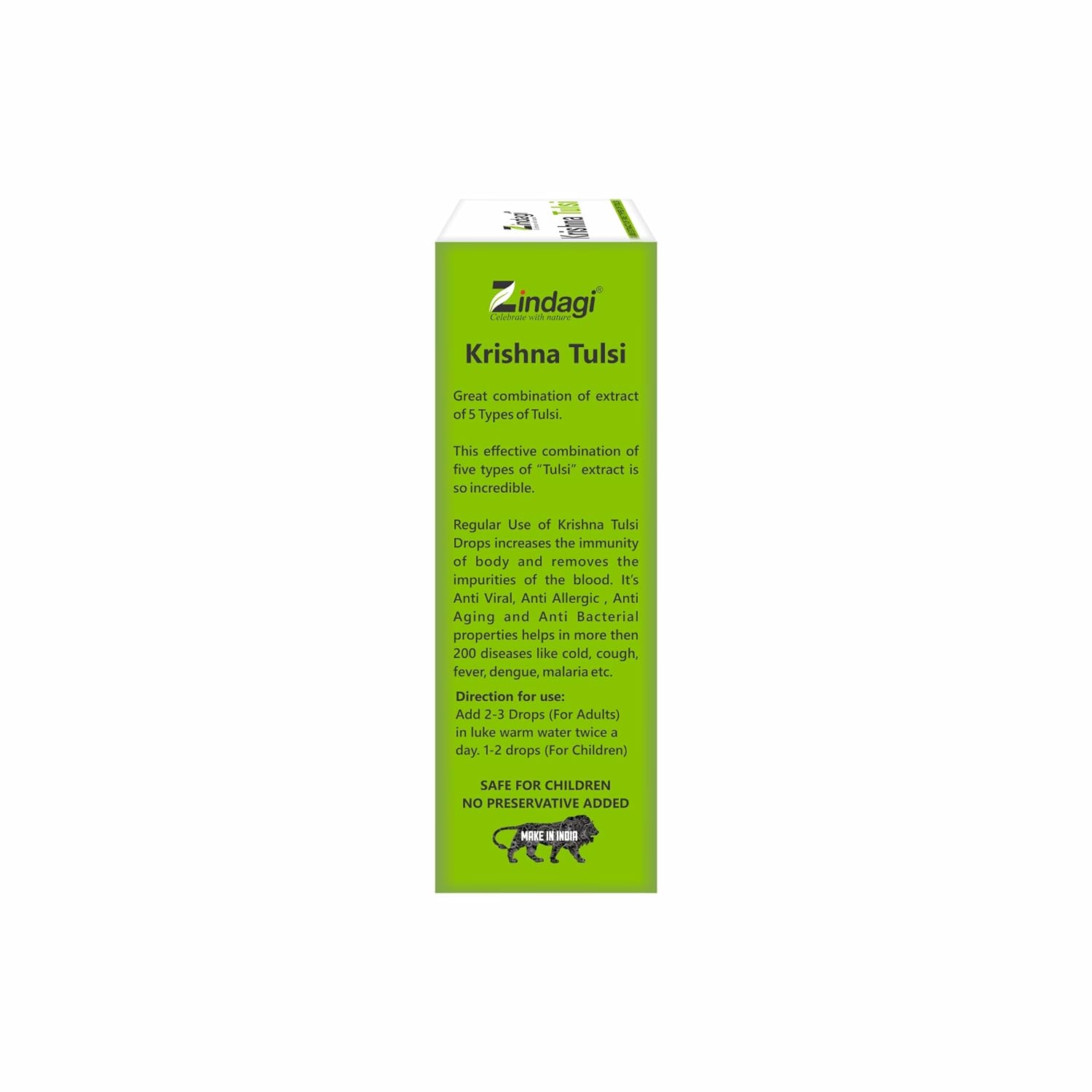Zindagi Krishna Tulsi Ras contains five different types of tulsi extract. This natural tulsi liquid is in oil form. Zindagi tulsi pure extract has no chemical, no preservative. Krishna tulsi is a 100% pure, natural & concentrated. Material Feature: 100% vegetarian, Shelf life 24 months, Safe for daily use. Tulsi Ark is useful for every one. Tulsi Liquid contains no sugarKrishna_Drop_3