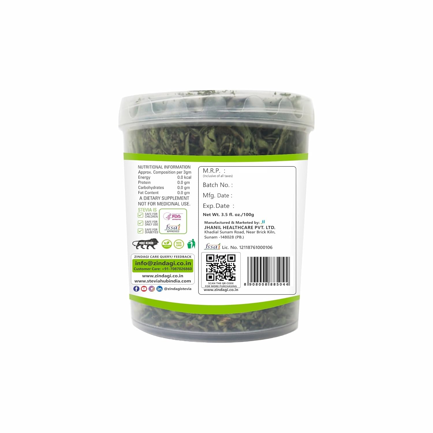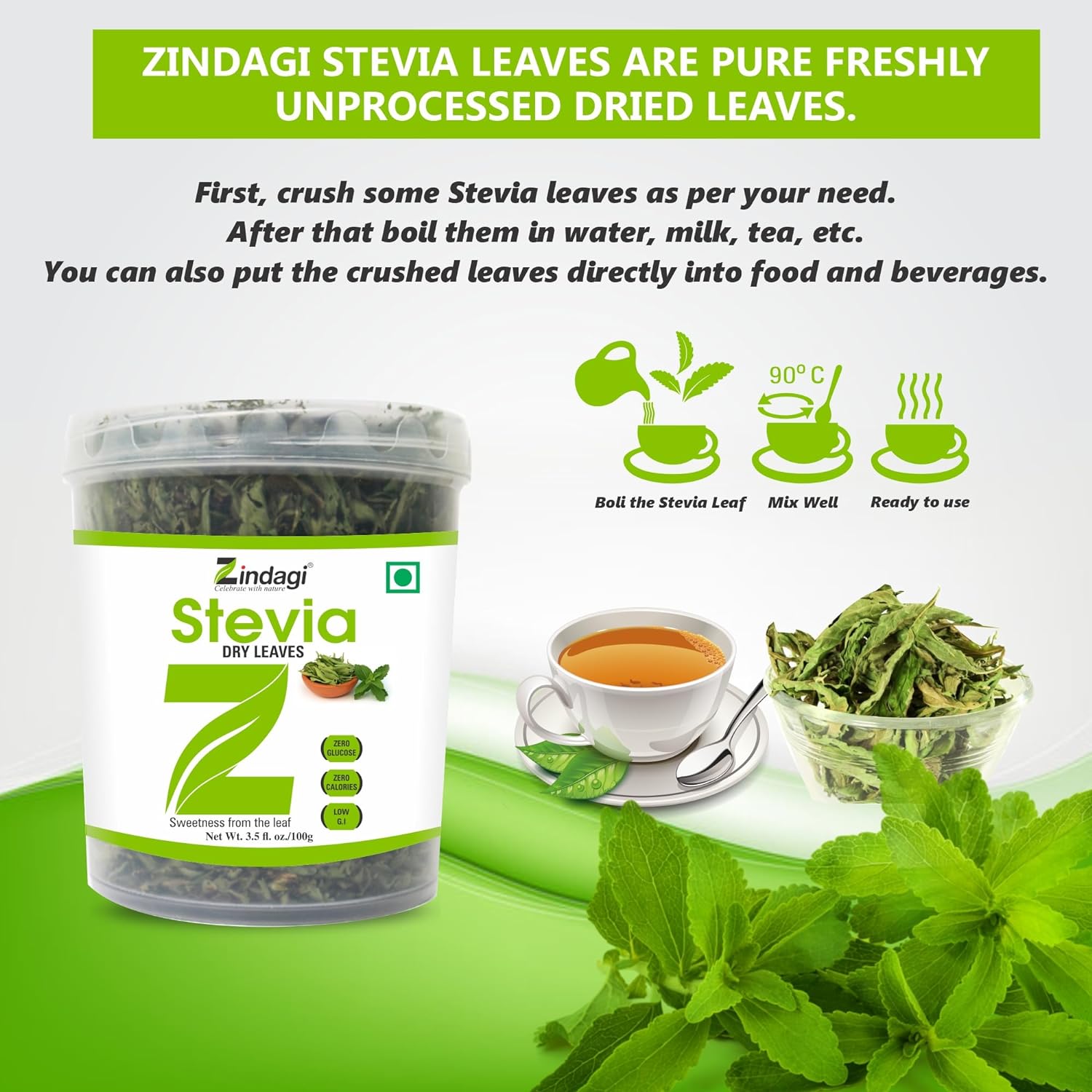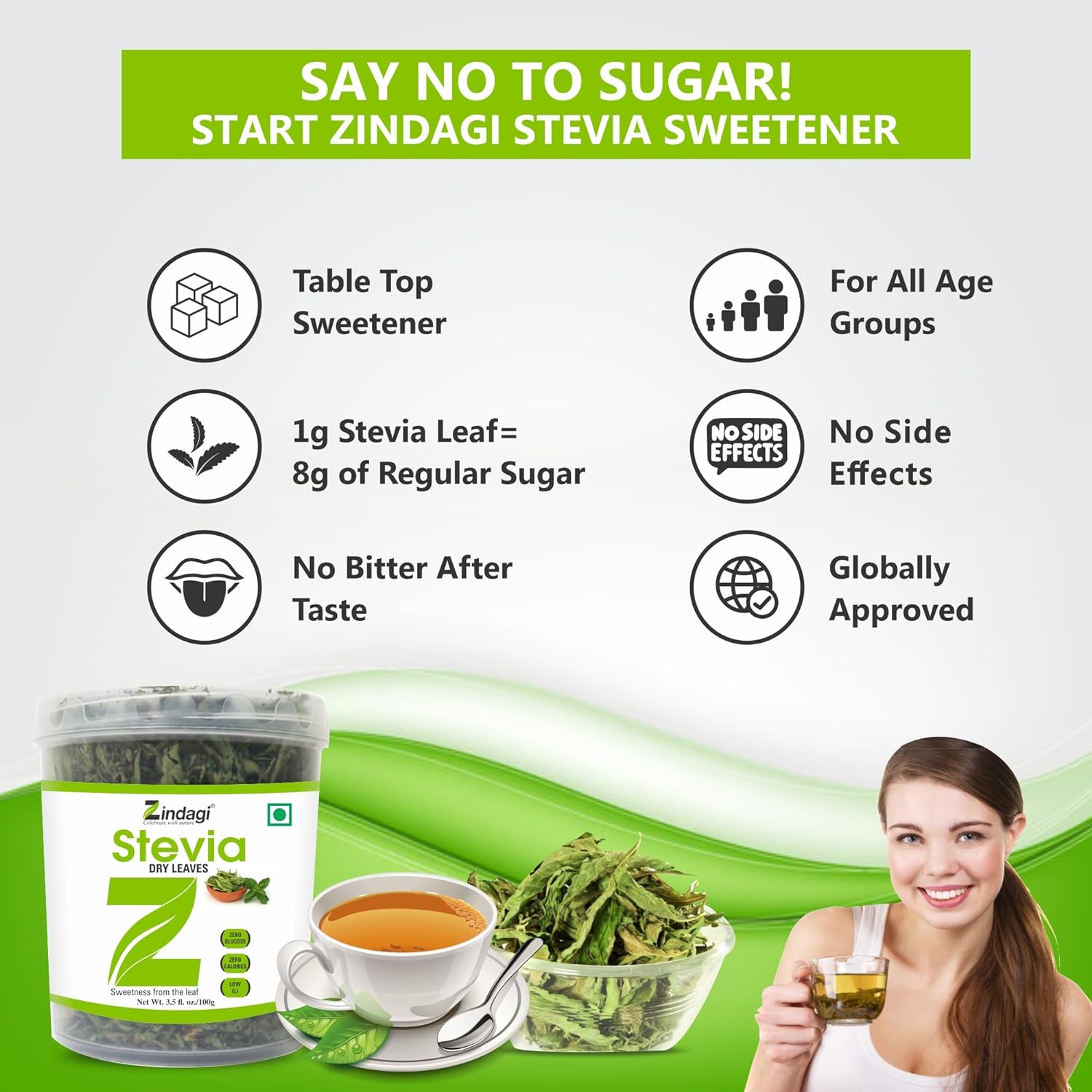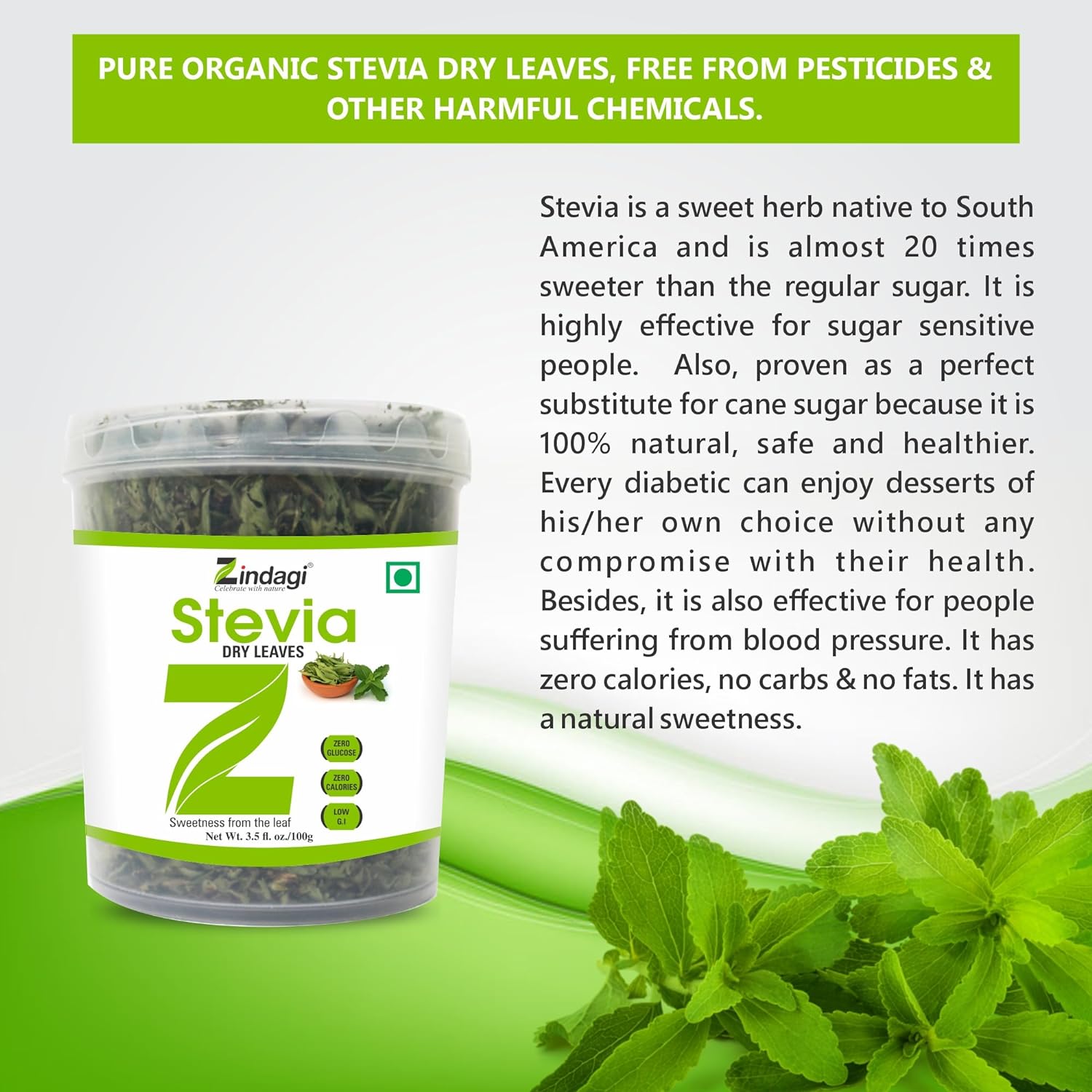 Zindagi Stevia zero sugar is a 100% natural sweetener. It is very helpful to reduce calories. Pure Organic Stevia Dry Leaves, free from pesticides & other harmful chemicals. 100% Diabetic & Obese friendly with assured quality. Zindagi Stevia Leaves are pure freshly unprocessed dried leaves. Stevia is the best substitute of refined sugar. Unlike other sweeteners it does not contain any artificial sweeteners and chemicals like Aspartame, Sucralose and Lactose.Stevia_leaves_100g_1