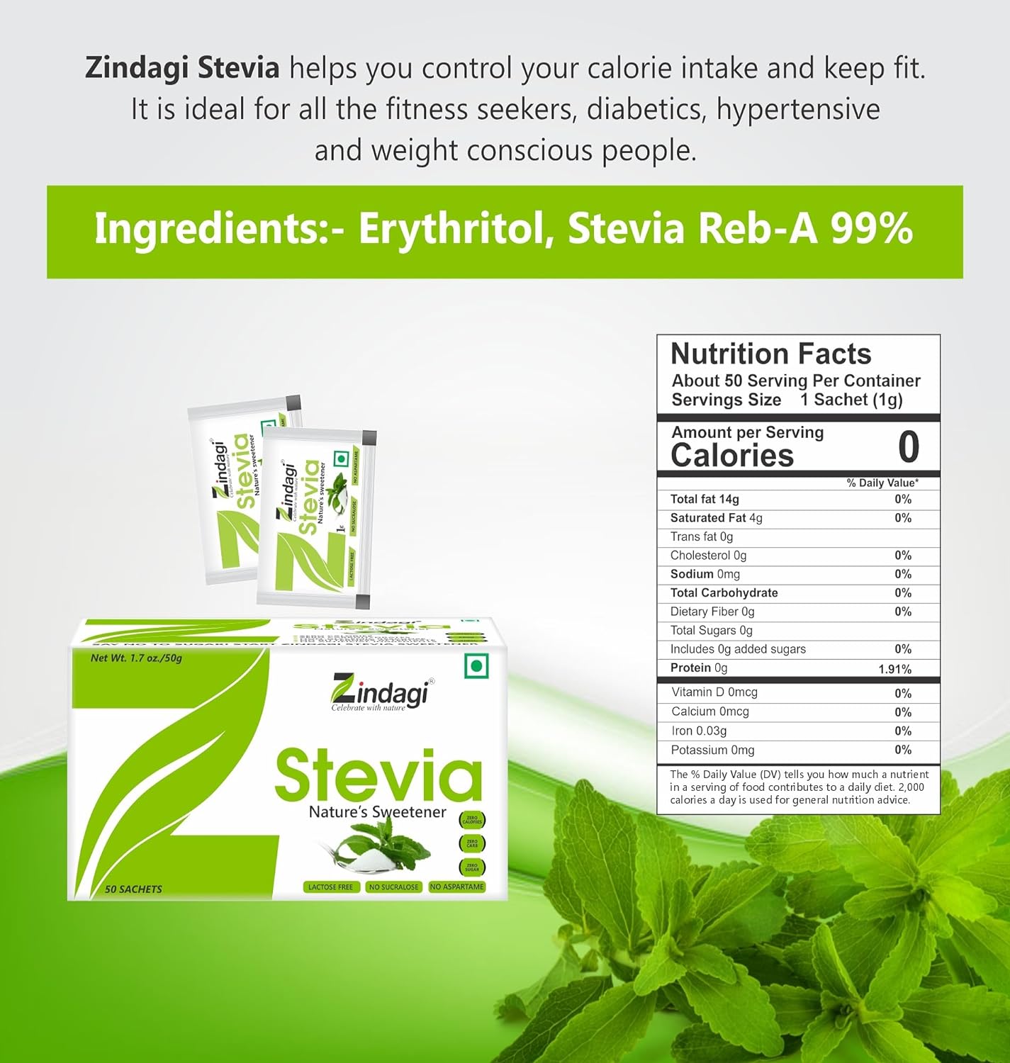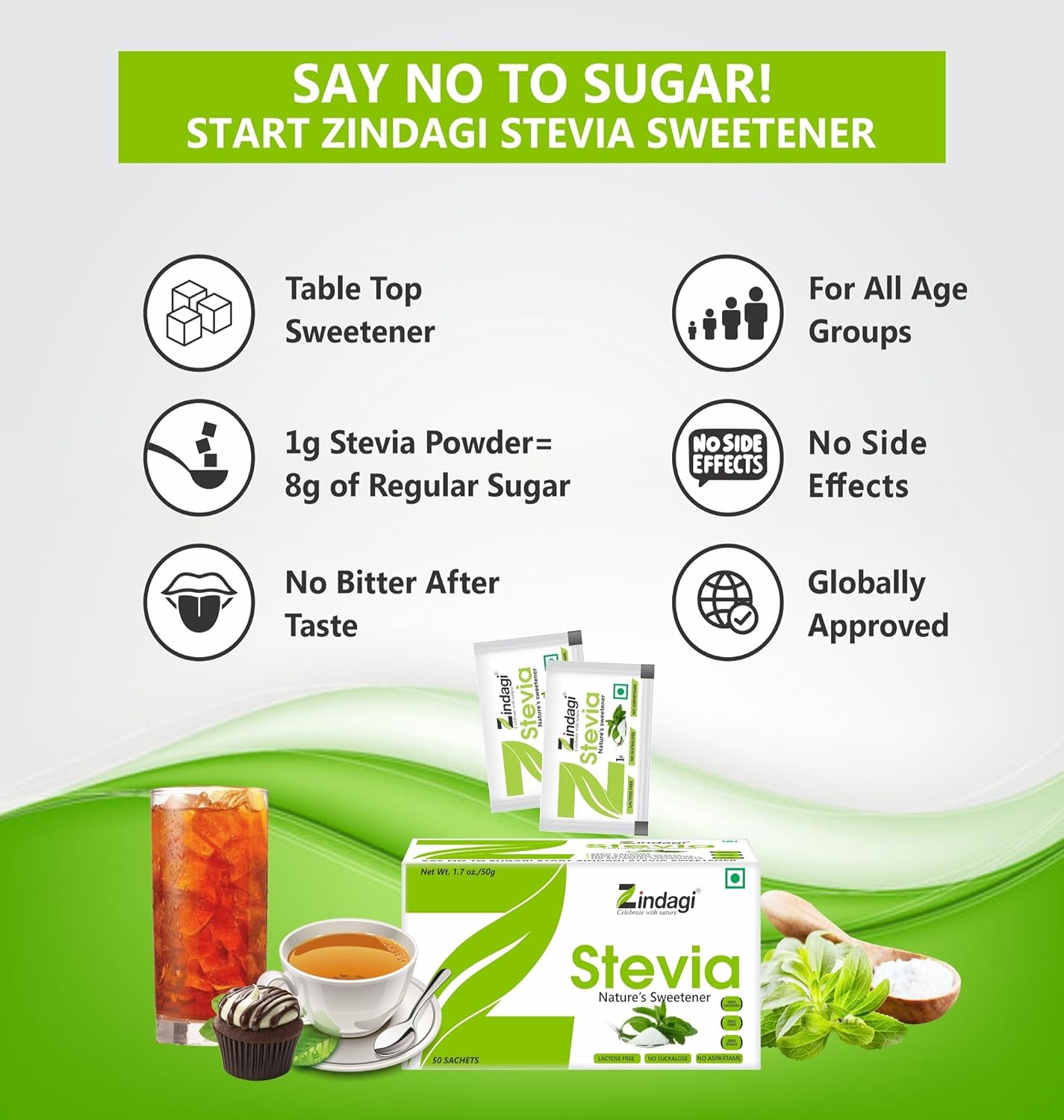 Zindagi Stevia Powder Is A 100% Natural Replacement Of Cane Sugar. It Is A Perfect Addition To Your Morning Coffee & Tea. Stevia Is 100% Diabetic & Obese Friendly With Best Tasting Zindagi Stevia Powder Available In The Market. Unlike Other Sweeteners It Does Not Contain Any Artificial Sweeteners & Chemical like Aspartame, Sucralose and Lactose. Stevia Powder Is Free From Nasty Additives With Zero Calories & No Carbs. Natural Stevia Drops Could Be Blend Easily In All Desserts & Beverages. Reasonable With Assured Quality. Shelf Life 24 Months.Stevia_sachet_50gm_3