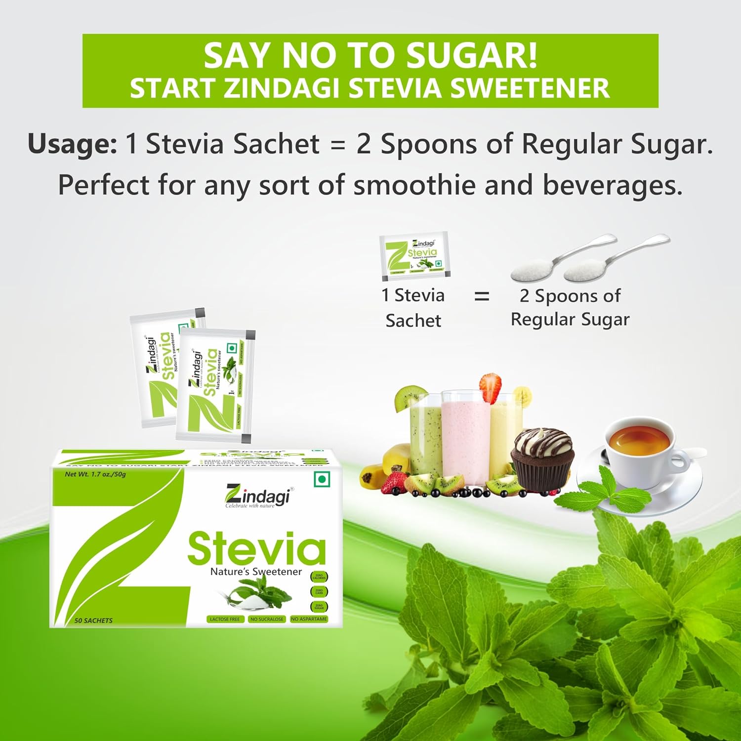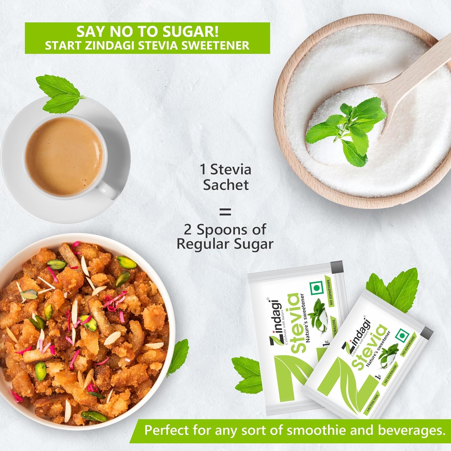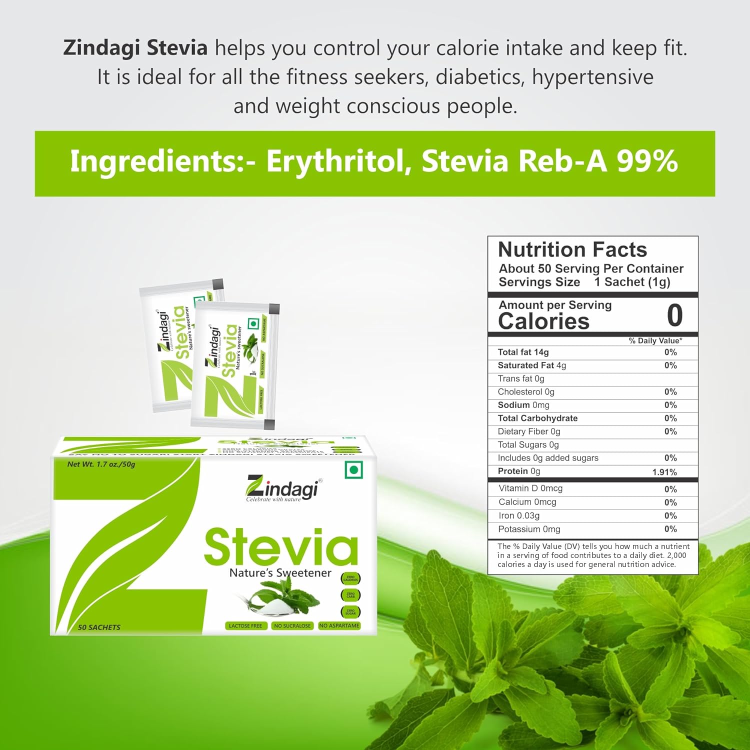 Zindagi Stevia Powder Is A 100% Natural Replacement Of Cane Sugar. It Is A Perfect Addition To Your Morning Coffee & Tea. Stevia Is 100% Diabetic & Obese Friendly With Best Tasting Zindagi Stevia Powder Available In The Market. Unlike Other Sweeteners It Does Not Contain Any Artificial Sweeteners & Chemical like Aspartame, Sucralose and Lactose. Stevia Powder Is Free From Nasty Additives With Zero Calories & No Carbs. Natural Stevia Drops Could Be Blend Easily In All Desserts & Beverages. Reasonable With Assured Quality. Shelf Life 24 Months.